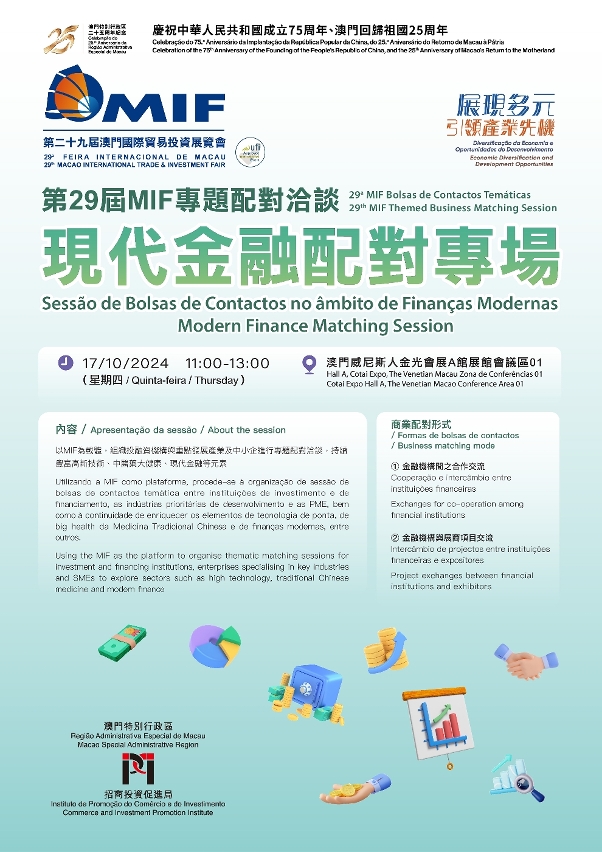 The “Modern Finance Matching Session” will invite the 29th MIF Partner City – Shenzhen, the Guangdong-Macao In-Depth Co-operation Zone in Hengqin, and Macao financial institutions and enterprises for discussions and exchanges. This session will also organise meetings for investment and financing institutions with key industries such as high technology, traditional Chinese medicine and big health, and modern finance, as well as SMEs, aiming to leverage the important role of the exhibition platform to promote the diversified development of the “1+4” industries.