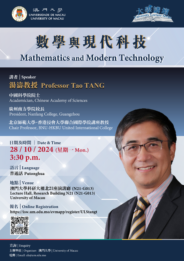 The University of Macau (UM) will hold a talk titled ‘Mathematics and Modern Technology’ on 28 October (Monday) as part of its University Lecture Series. Tang Tao, academician of the Chinese Academy of Sciences (CAS), will be the speaker. During the talk, Prof Tang will discuss the pivotal role of mathematics in technological innovation. All are welcome to attend.