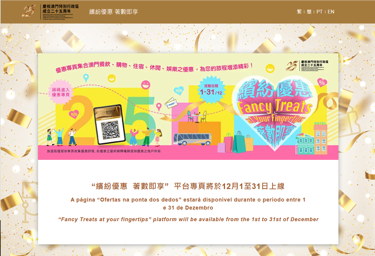 The promotional webpage “Fancy Treats at Your Fingertips” showcases a wide range of special offers presented by various integrated resort enterprises, SMEs and transport service operators in celebration of the 25th anniversary of the establishment of the Macao SAR. There are more than 450 special offers including around 280 catering offers. The special offers cover dining, shopping, accommodation, leisure and entertainment as well as admission tickets. The website enables residents’ and visitors’ seamless access to such information, with the aim to spur spending in festive December and promote community travel as consumers stream into local districts, especially through SMEs’ offers, for greater synergistic effect.