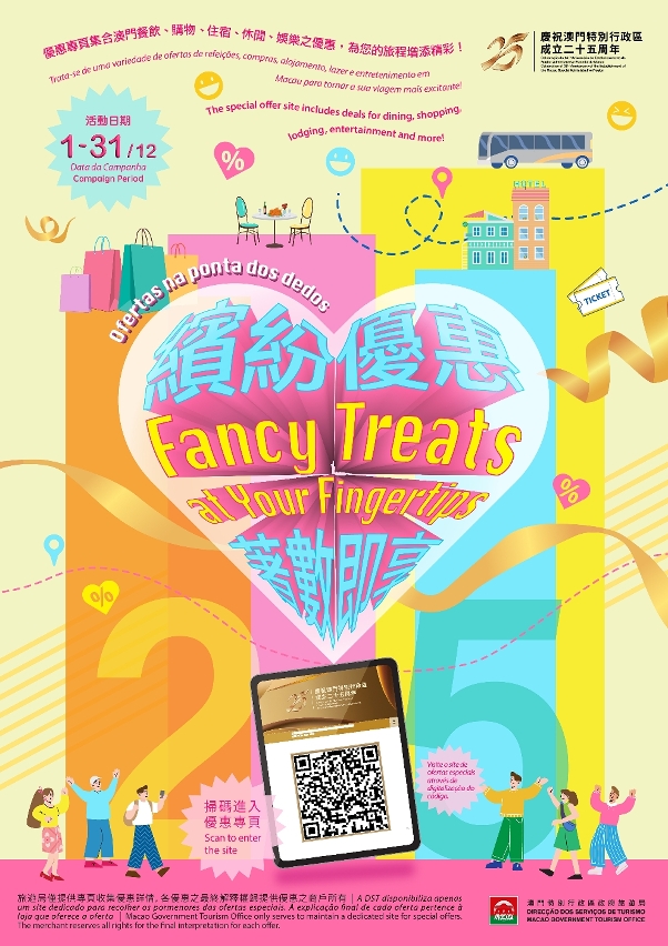 Macao Government Tourism Office (MGTO) will introduce a promotional webpage “Fancy Treats at Your Fingertips” to bring into the limelight more than 450 special offers of local integrated resort enterprises and small and medium-sized businesses (SMEs) in celebration of the 25th anniversary of the establishment of the Macao SAR. The themed webpage will be available between 1 and 31 December. Macao residents and visitors can check out and enjoy these offers in the city for a deeper experience of Macao’s diverse “tourism +” and unique charm, in joyful celebration of the handover anniversary.