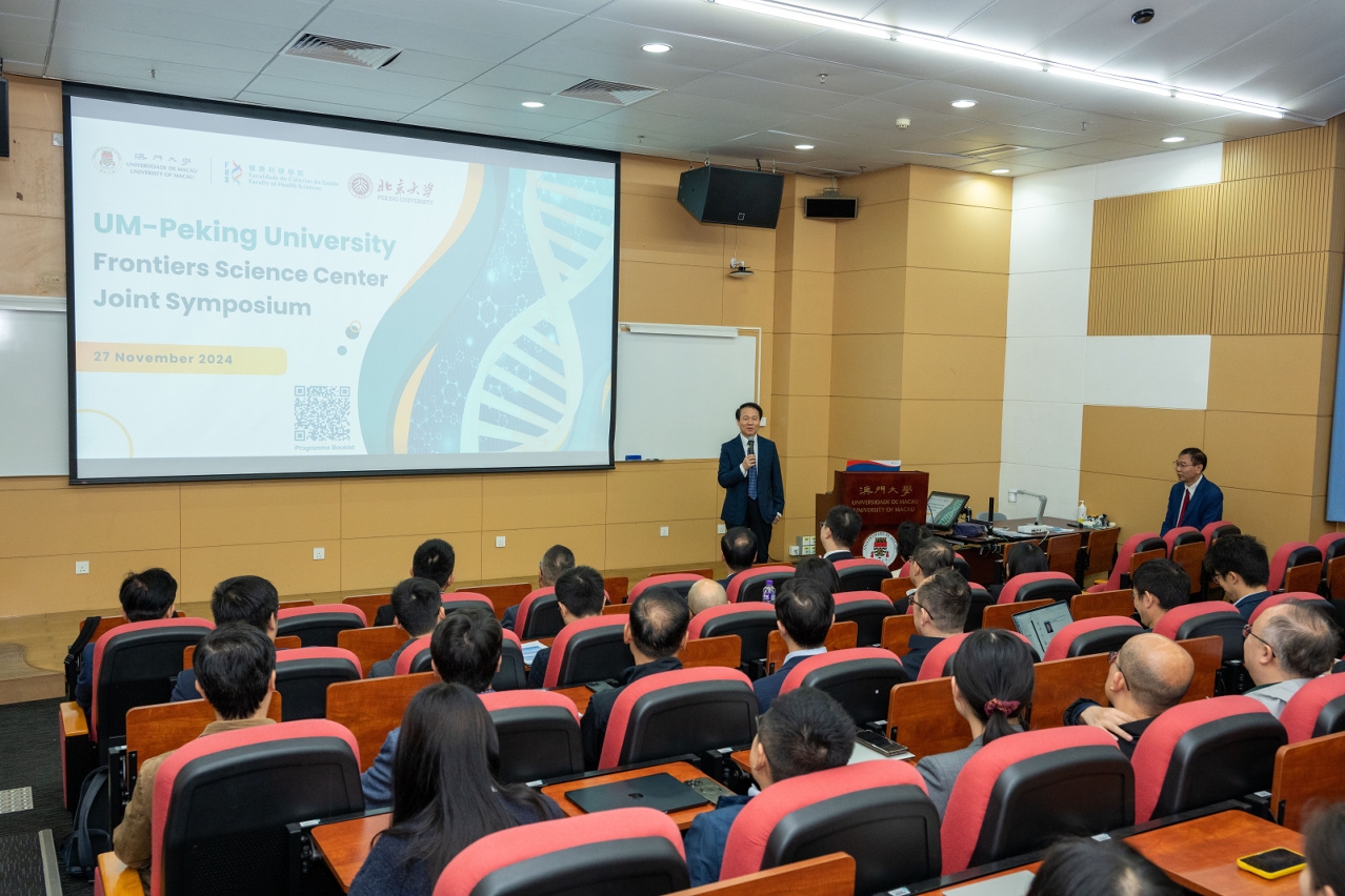 The UM-Peking University Frontiers Science Center Joint Symposium was held today (27 November) at the University of Macau (UM). Jointly organised by the Faculty of Health Sciences (FHS) of UM, the Ministry of Education Frontiers Science Center for Precision Oncology (FSCPO) of UM, and the Frontiers Science Center for Cancer Integrative Omics (FSCCIO) of Peking University (PKU), the event brought together around 150 experts and researchers in biomedical sciences to discuss the latest developments in cancer treatment.