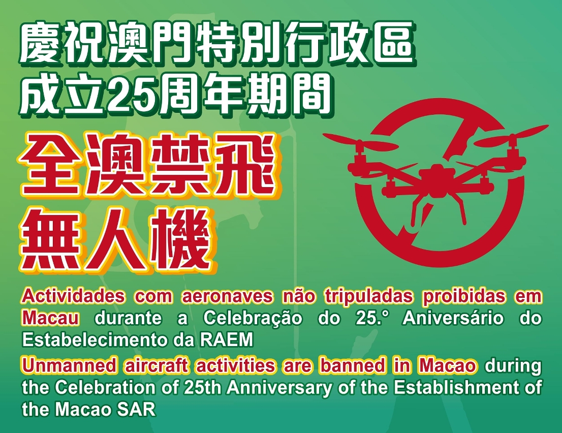 According to Paragraph 66 of the "Air Navigation Regulation of Macao" approved by the Executive Order No. 43/2021, the Civil Aviation Authority (AACM) will implement a citywide ban on unmanned aircraft activities from 14 to 22 December 2024, to ensure the smooth and safe conduct of the celebration of 25th anniversary of the establishment of the Macao SAR.
