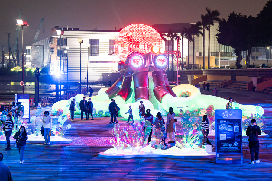 Delivering six subthemes under the main theme of “Symphony of Time and Space”, the event covered six districts as follows: “Pulse of the Future” in Praia do Manduco District, “Interlude of the Ocean” in Nam Van District, “Glorious Epoch” in Zona Nova de Aterros do Porto Exterior (NAPE), “Realm of Fantasy” in Northern District, “Fusion of Arts and Culture” in Taipa, and “Nostalgic Aura” in Coloane. 23 locations were dazzled by 31 installations including 6 flagship installations, 4 art installations, 12 light installations and 9 interactive installations. There were three themed mapping shows namely “Create the Future”, “Connect” and “100 FUN” at the Front square of Macao Science Center (the façade of Macao Science Center) and Largo dos Bombeiros in Taipa (the façade of Cozinha Pinocchio Taipa) respectively. 1,008 sessions of mapping shows were staged in total at the two aforementioned locations.