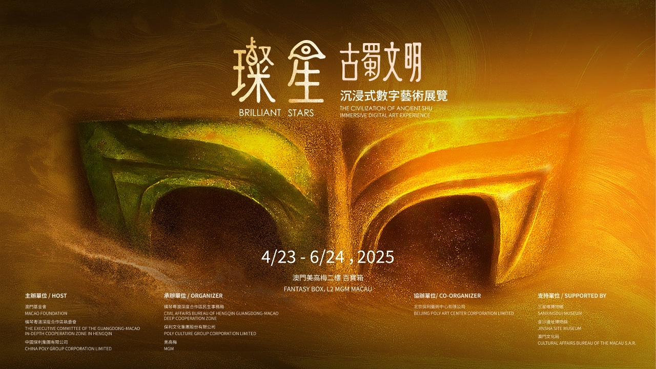 On April 23, the “BRILLIANT STARS - THE CIVILIZATION OF ANCIENT SHU Immersive Digital Art Experience”, an innovative exhibition integrating digital art, interactive technology and archaeological narratives, celebrated its grand opening at the Fantasy Box in MGM MACAU. Open to the public from April 24 to June 24, this extraordinary cultural showcase is jointly organized by the Macao Foundation, the Executive Committee of the Hengqin Guangdong-Macao In-depth Cooperation Zone, and China Poly Group, and co-organized by the Civil Affairs Bureau of the Hengqin Guangdong-Macao In-depth Cooperation Zone, Poly Culture Group, and MGM.