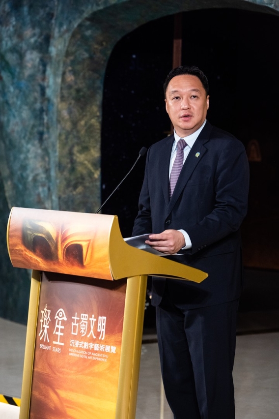 Wu Zhiliang, Su Kun, and Liu Juncai delivered speeches during the ceremony, followed by a ribbon-cutting ceremony officiated by Huang Liuquan, Kenneth Feng, Leong Wai Man and Xu Bei, marking the inauguration of the “BRILLIANT STARS - THE CIVILIZATION OF ANCIENT SHU Immersive Digital Art Experience”.