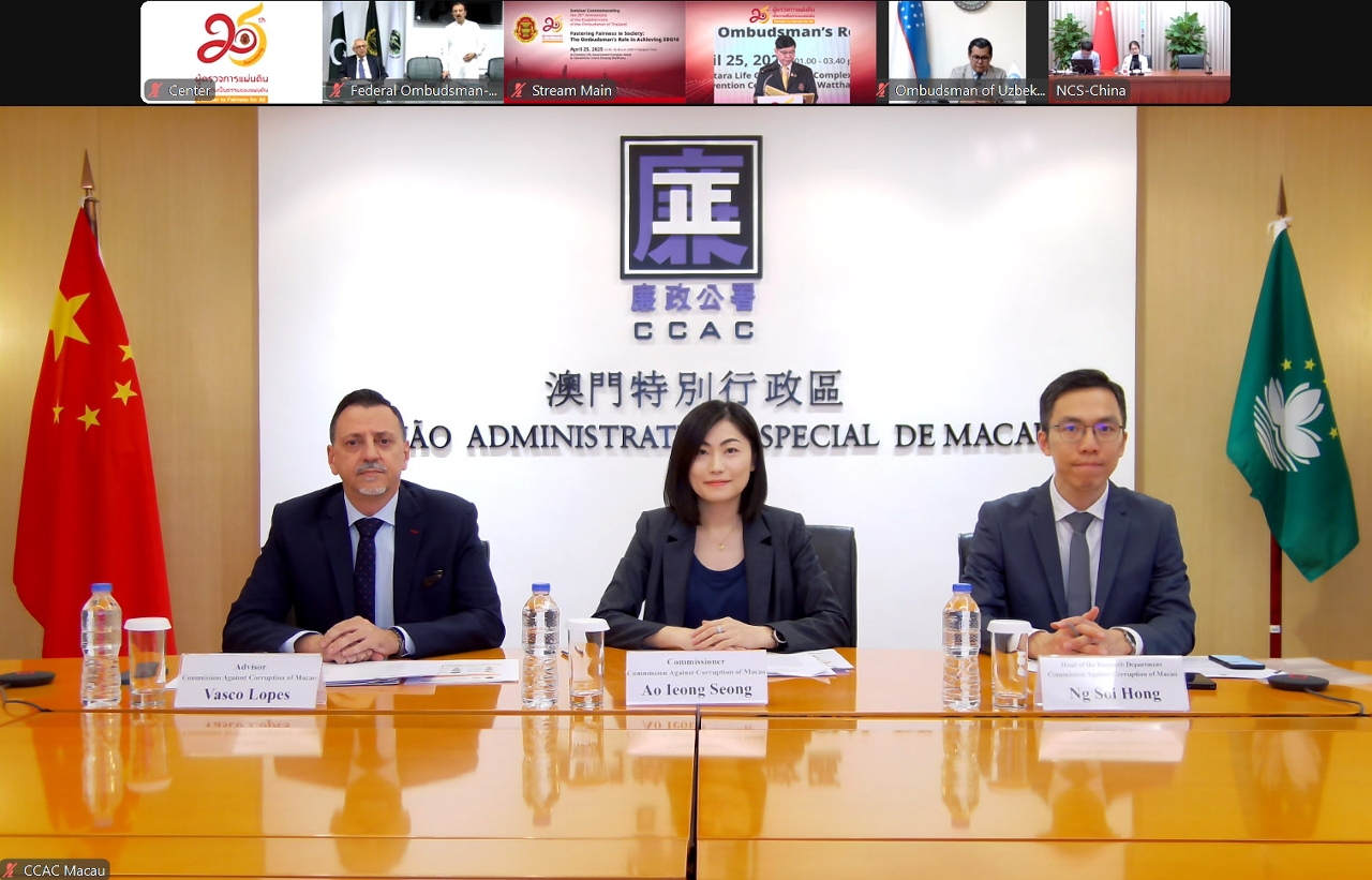 The Commissioner Against Corruption, Ao Ieong Seong, participated in the International Seminar Commemorating the 25th Anniversary of the Establishment of the Ombudsman of Thailand at invitation by videoconferencing this afternoon.