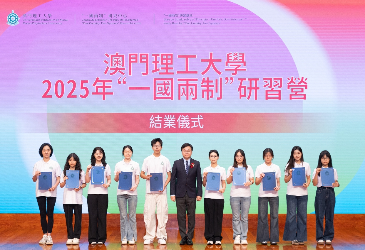 To deepen understanding among faculty and students from Mainland universities on the successful practice of “One Country, Two Systems” with Macao characteristics and to experience Macao’s development since its return to the motherland, Macao Polytechnic University (MPU) hosted the “One Country Two Systems” Study Camp, which received an enthusiastic response. The closing ceremony of the “One Country Two Systems” Study Camp 2025 was held at the MPU Auditorium, where 153 teachers and students from 11 Mainland universities completed their study journey. Officiating guests included Teng Sio Hong, Deputy Director of the Education and Youth Development Bureau (DSEDJ) of the Macao SAR Government; Marcus Im, Rector of MPU; Cheang Hong Kuong, President of the Chinese Educators’ Association of Macau; Lao Lai Mui, President of the Macao Catholic Schools Association; Heong Mui, President of the Macau Civil Service Education Association; and Leng Tiexun, Director of the “One Country Two Systems” Research Centre of MPU. They jointly presented completion certificates to participants amid a vibrant atmosphere.