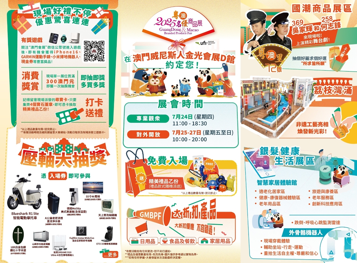 The 2025 Guangdong & Macao Branded Products Fair (2025GMBPF) will be held from 24 to 27 July in Cotai Expo Hall D, The Venetian Macao. With the first day (24 July) designated as “Trade Visitor Day”, the event will open to the public from 25 to 27 July. The public open day features a variety of experiences, including smart homes, historical and cultural charm, and Chinese and Western cuisine, with generous gifts prepared by the organisers during the event.