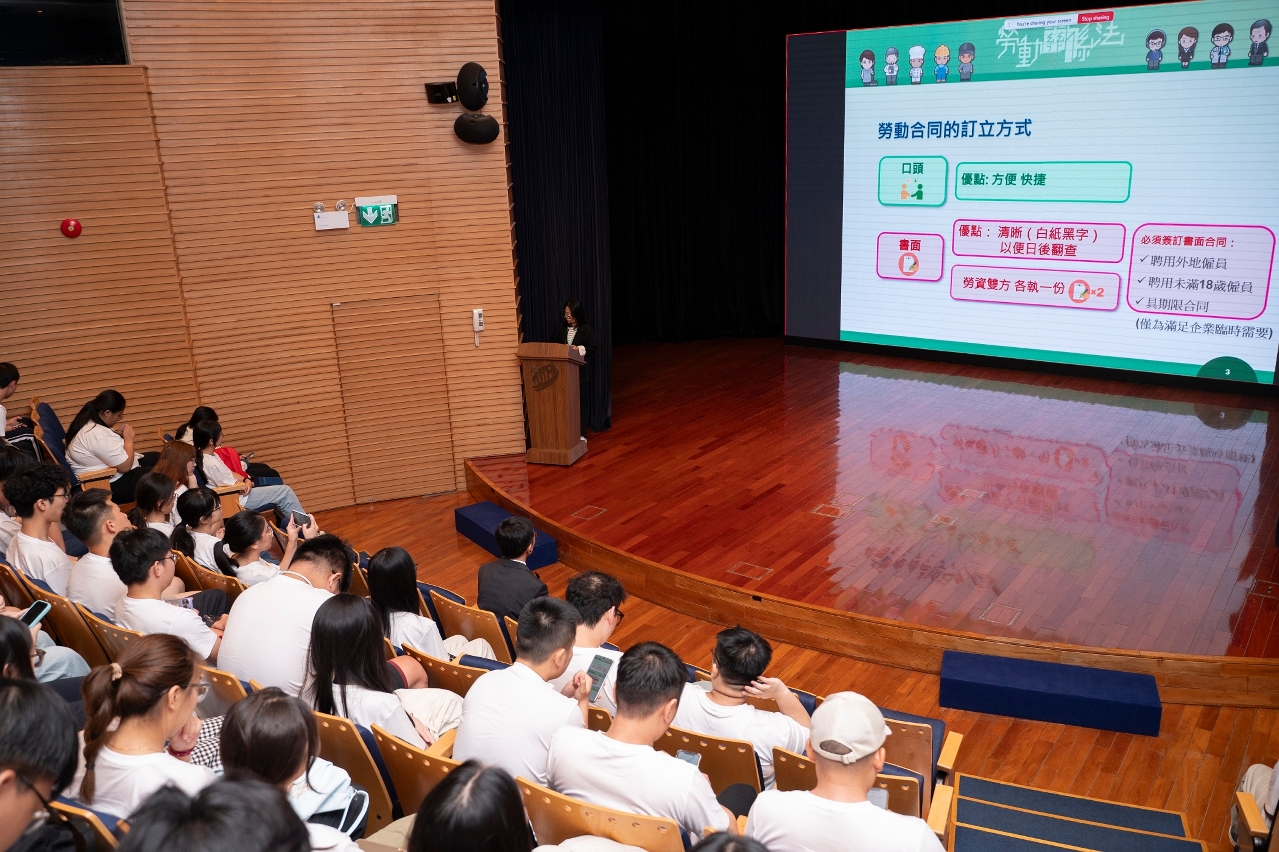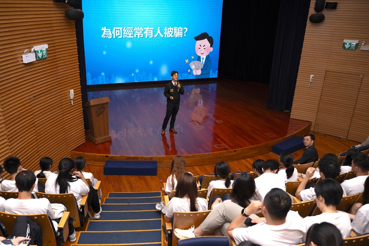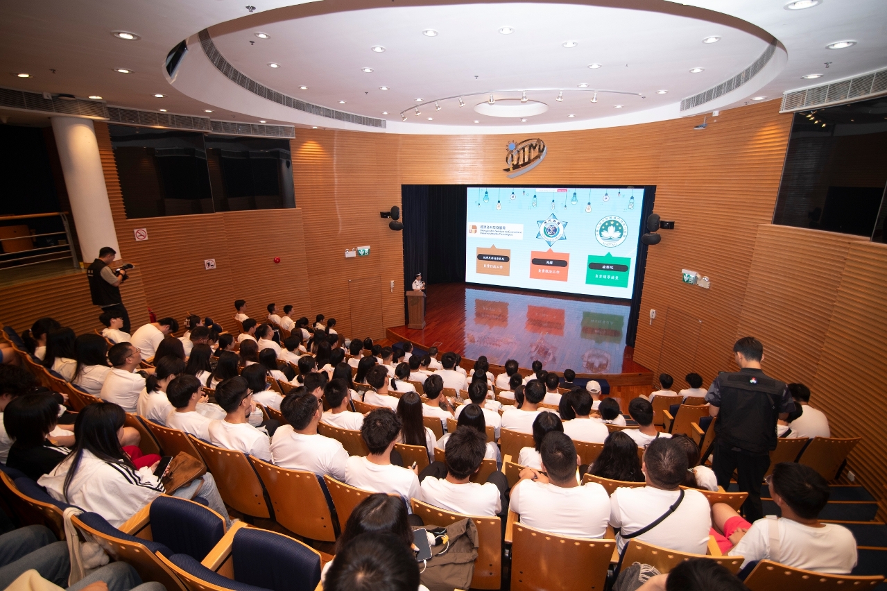 Additionally, to implement education on the spirit of “loving the motherland and Macao”, and to provide new students with a deeper understanding of national conditions, the University held its first national flag-raising ceremony of the new academic year on the same day, along with several seminars. Among them, officers from Customs of Macao SAR were invited to deliver a lecture on “Intellectual Property Rights and Combating Illegal Trafficking”. Furthermore, the Judicial Police was invited to conduct a seminar on “Cybercrime and Fraud Prevention”, aimed at enhancing students’ vigilance and awareness to prevent them from falling victim to online crimes and scams. Moreover, the Labour Affairs Bureau also dispatched officers to offer an educational session on the “Popularisation of Labour Laws”, helping students comprehend relevant regulations and avoid unintentional legal violations.