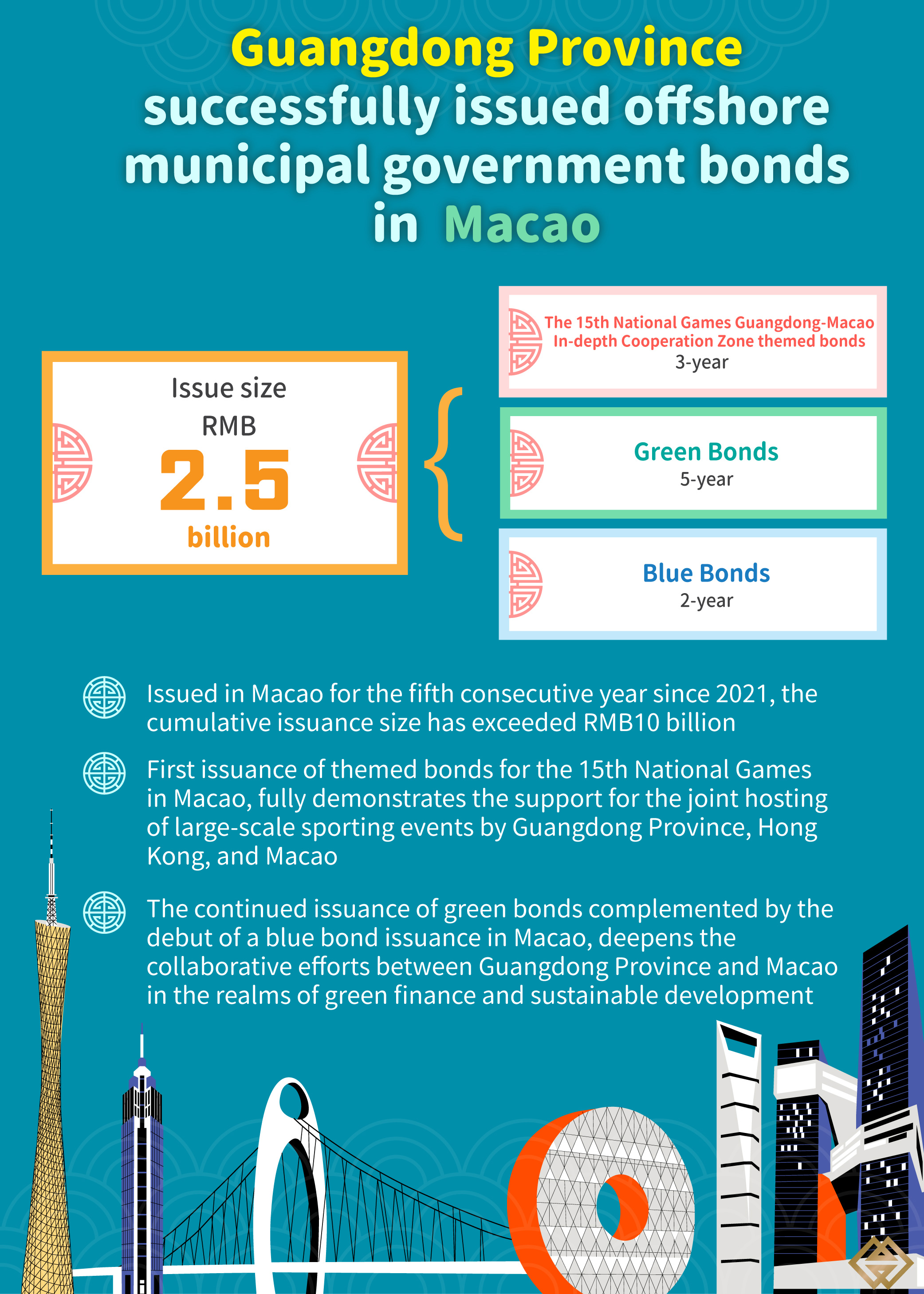 The People’s Government of Guangdong province successfully issued RMB 2.5 billion (hereinafter referred to as RMB) offshore RMB-denominated municipal government bonds today (26 August) in Macao Special Administrative Region. This issuance marks the fifth consecutive year since 2021 that the Guangdong Government has issued offshore RMB-denominated municipal government bonds in Macao. Additionally, this year introduces the first issuance of themed bonds for the 15th National Games and blue bonds in Macao. To date, the cumulative issuance size of municipal government bonds issued by Guangdong Government in Macao has exceeded 10 billion.The Monetary Authority of Macao congratulated on the successful bond issuance and expressed its gratitude to the Ministry of Finance of the People’s Republic of China and the People’s Government of Guangdong province for their support in the development of new financial businesses in Macao.