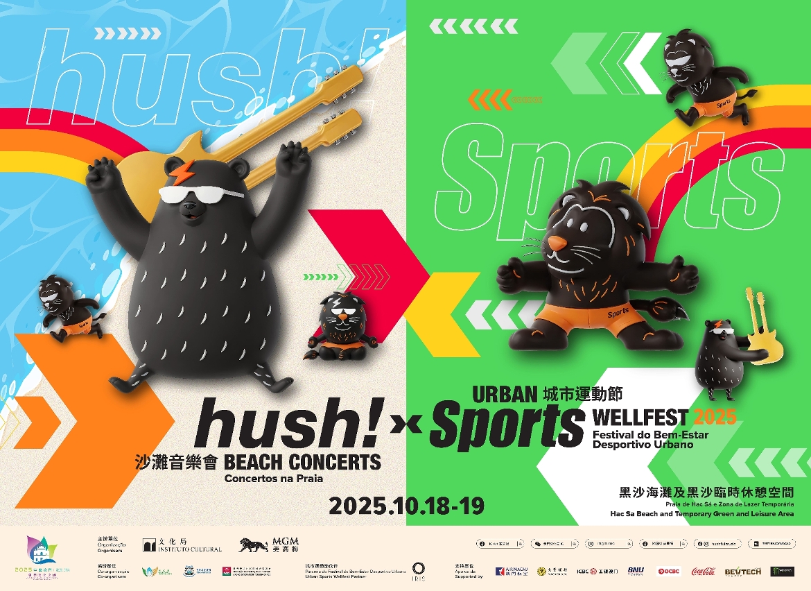 Jointly organized by the Cultural Affairs Bureau and the MGM, and co-organized by the Municipal Affairs Bureau, the Marine and Water Bureau, and the Macao Government Tourism Office, the “hush! Beach Concerts x Urban Sports Wellfest 2025” will be held from 18 to 19 October at the Hac Sa Beach and Temporary Green and Leisure Area. Get to know the first round of activities and Fest Prelude to be launched, previewing the highlights of the outdoor cross-disciplinary event fused with music and sports.
