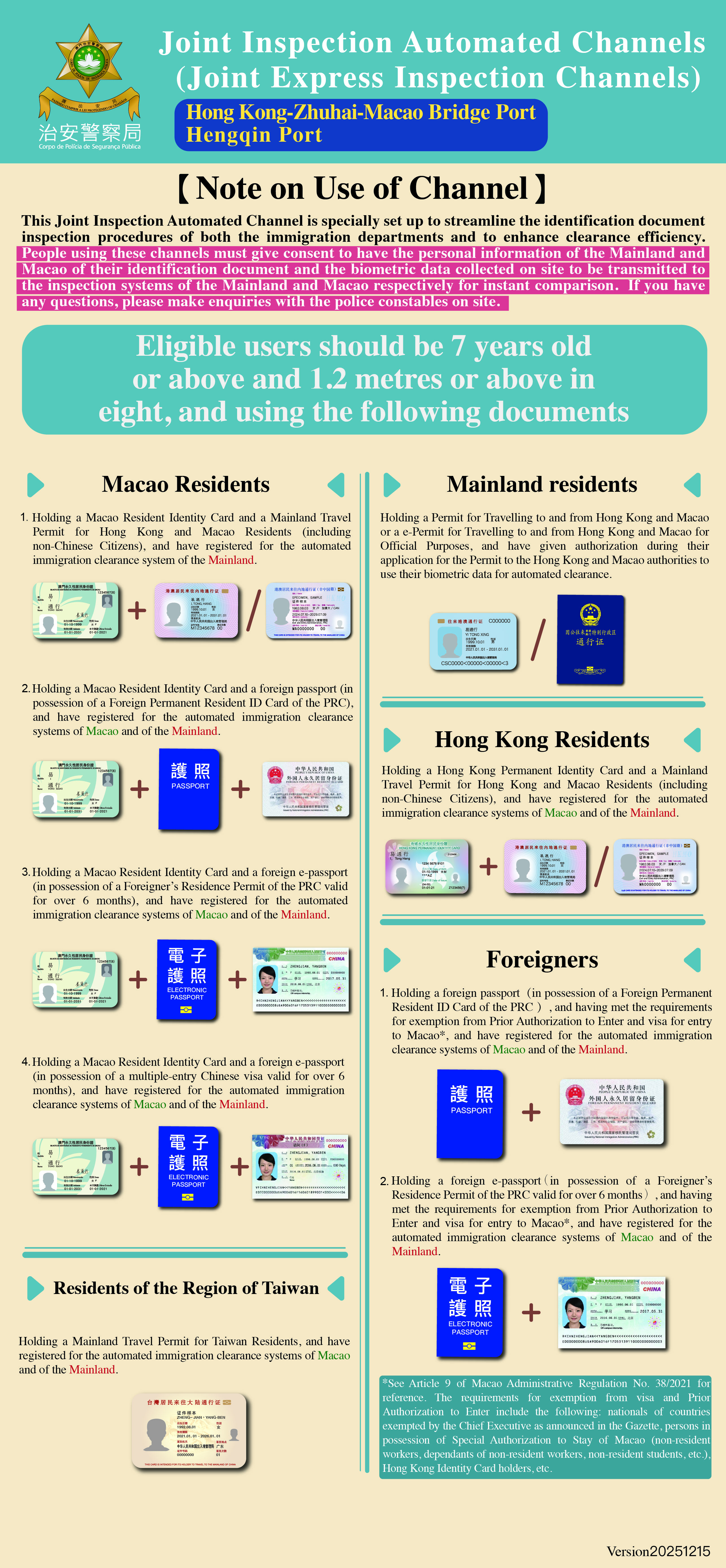 • Eligible foreign nationals can use the “automated immigration clearance channels” at the Zhuhai-Macao Port of the Hong Kong-Zhuhai-Macao Bridge