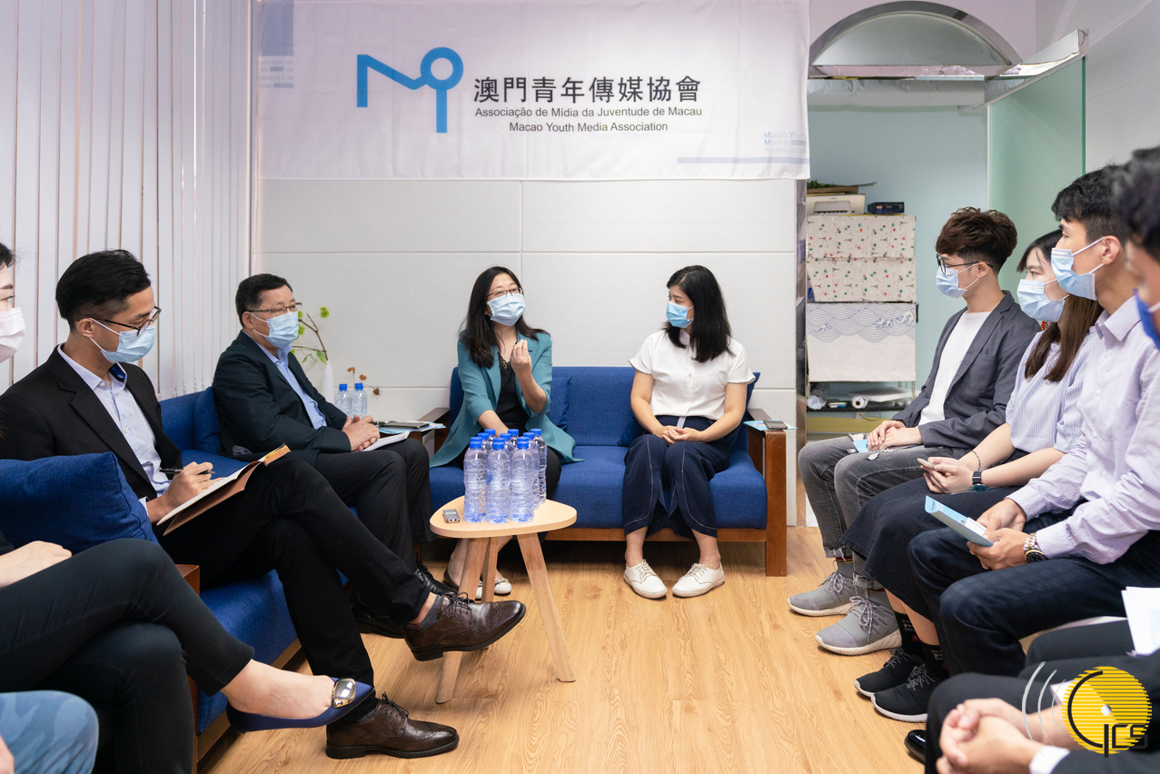 Directora do Gabinete de Comunicação Social (GCS), Inês Chan, lidera a sua equipa numa visita às instalações da Associação de Mídia da Juventude de Macau, onde trocam opiniões sobre o desenvolvimento do sector de comunicação social.
