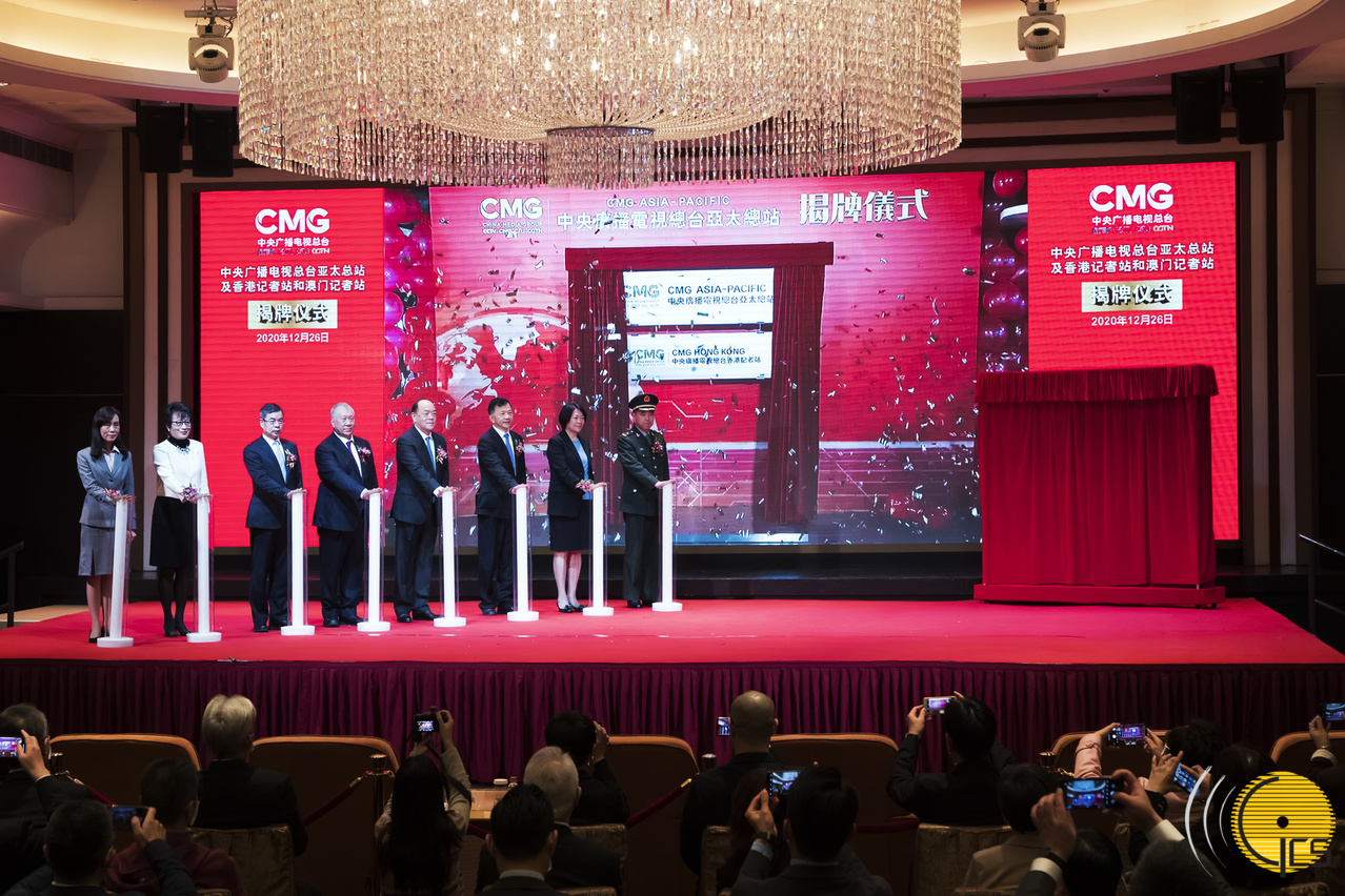 Chefe do Executivo, Ho Iat Seng, na cerimónia de descerramento da placa que marca a inauguração da representação da estação Ásia-Pacífico do China Media Group (CMG) e respectivas delegações de Hong Kong e Macau e cerimónia de lançamento das filmagens do documentário de grande escala "O Sabor de Macau".