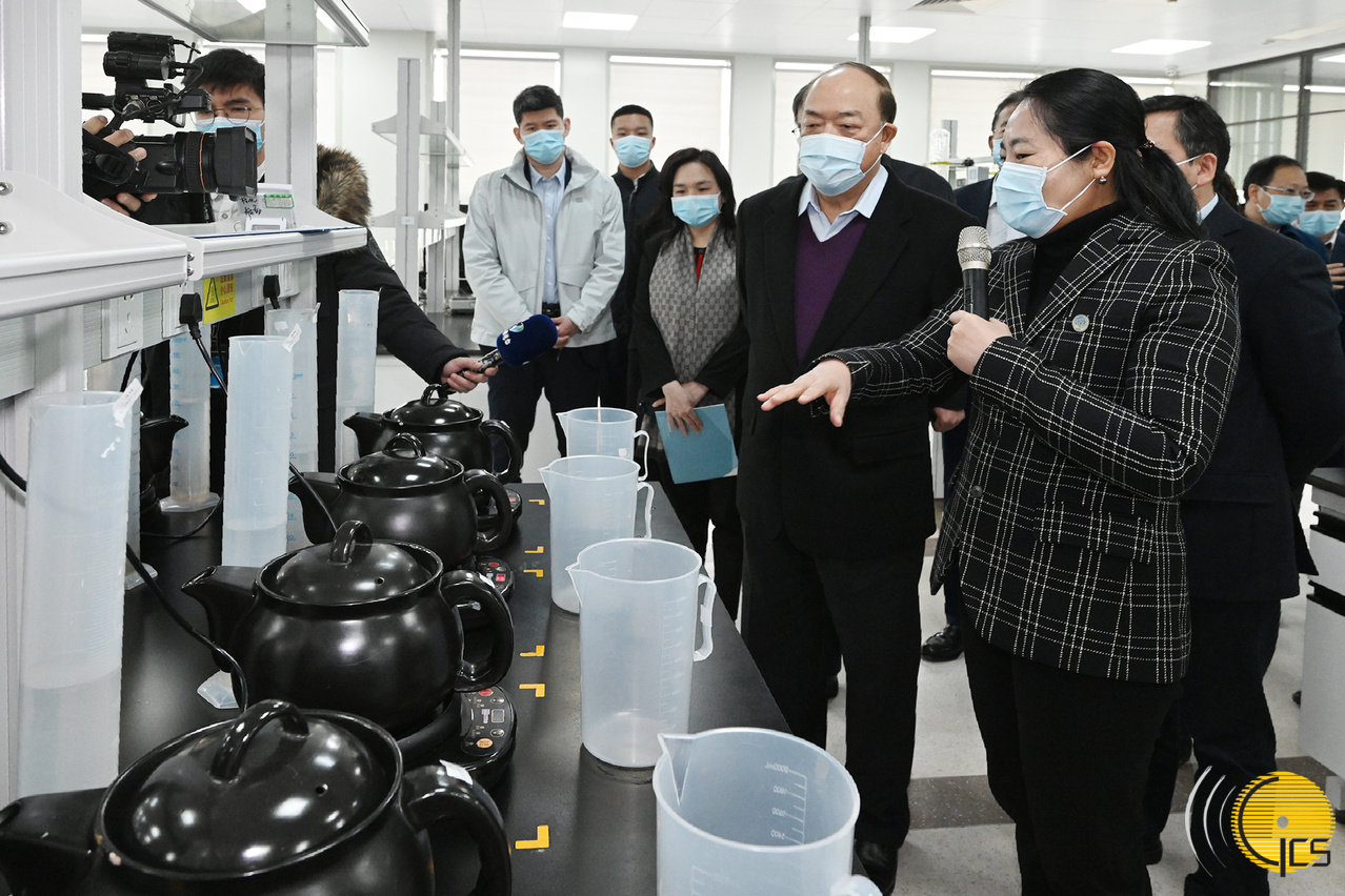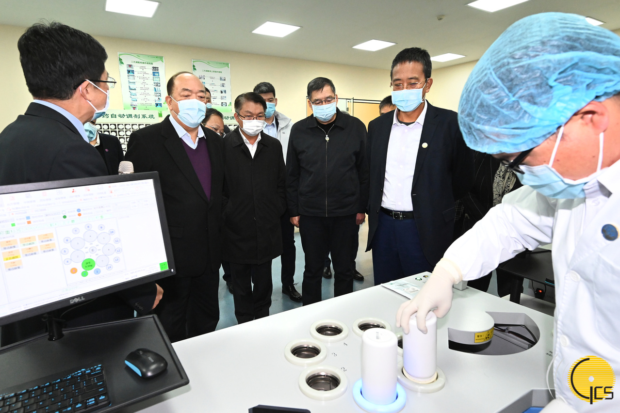 • Chefe do Executivo , Ho Iat Seng, acompanhado pelo presidente do município de Foshan , Zhu We (quinto à esquerda ), visita uma empresa de investigação e produção de medicamentos tradicionais chineses.