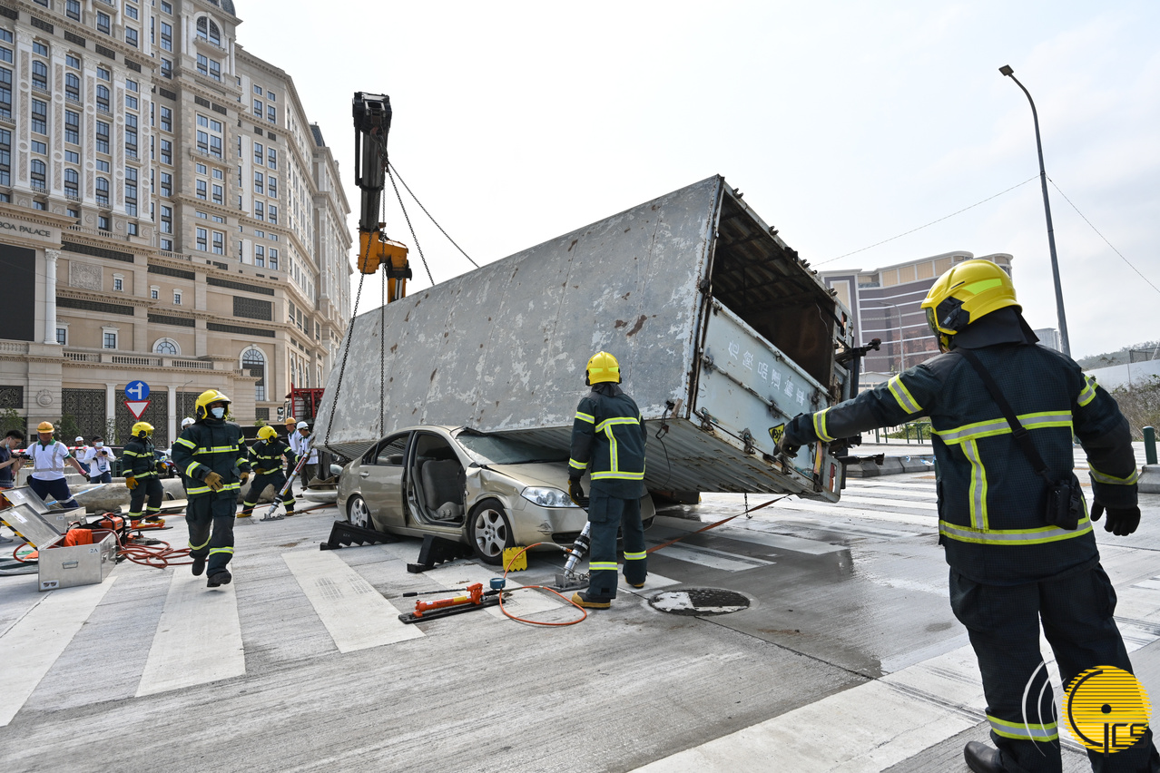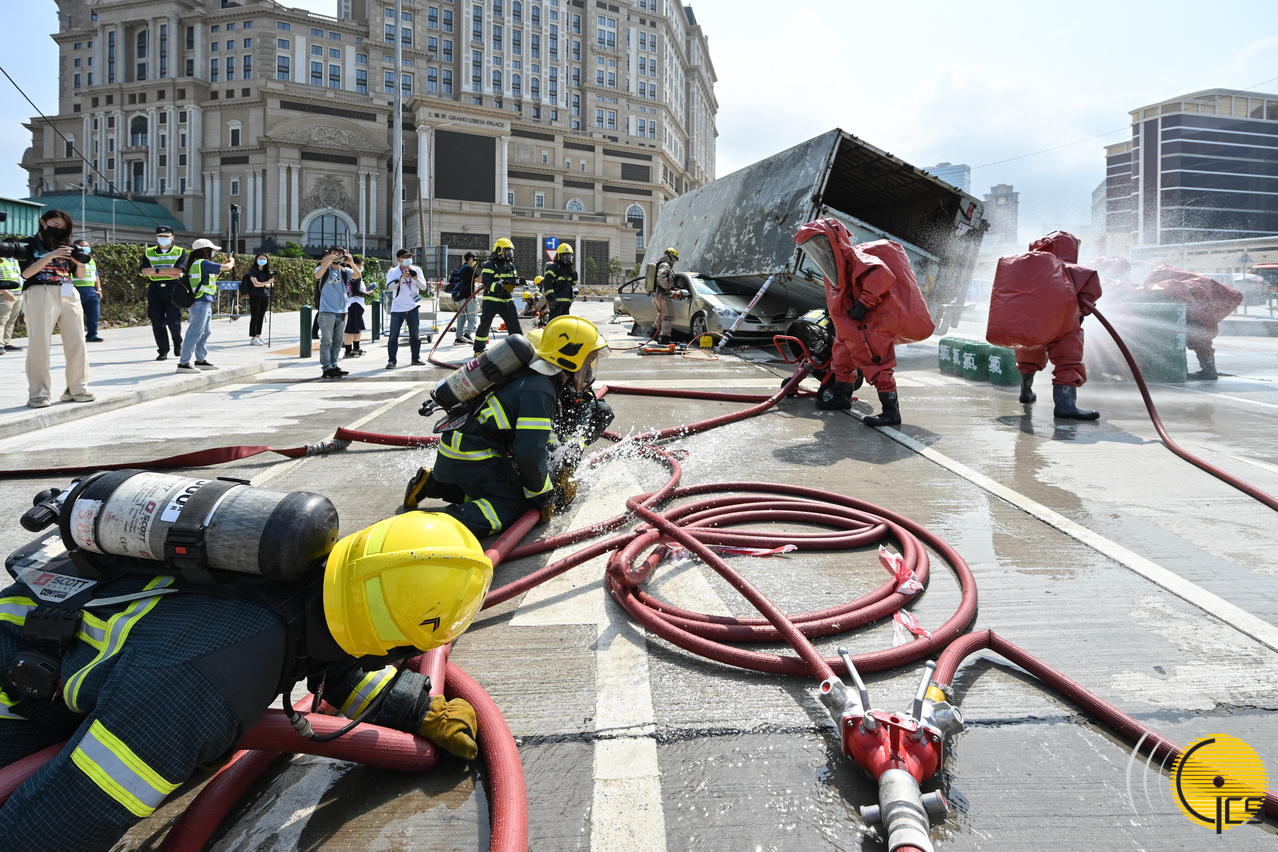 • Exercício de tufão “Peixe Cristal 2021”--- os bombeiros procedem acção de salvamento num acidente de viação durante o tufão e tratamento de um caso envolvendo matérias perigosas