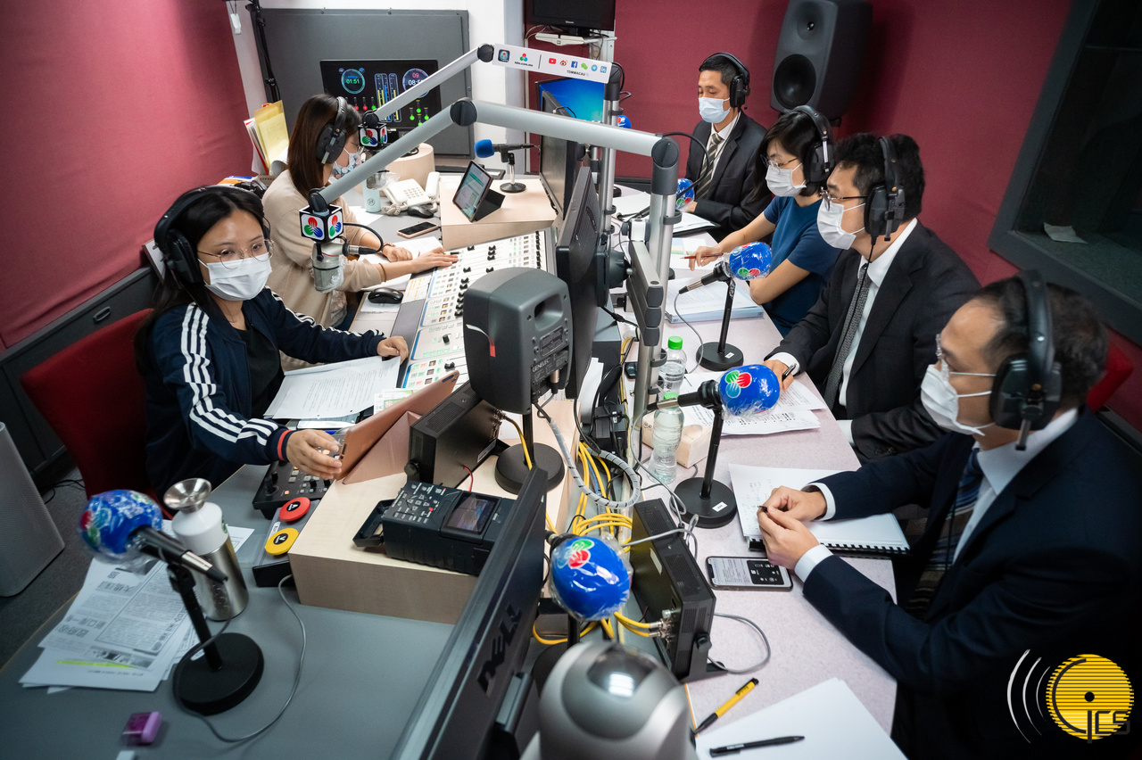 Presidente da Comissão de Assuntos Eleitorais da Assembleia Legislativa, Tong Hio Fong, adjunta do Comissário contra a Corrupção, Ao Ieong Seong, e outras individualidades presentes no programa de rádio "Fórum de Macau" da "Ou Mun Tin Toi".