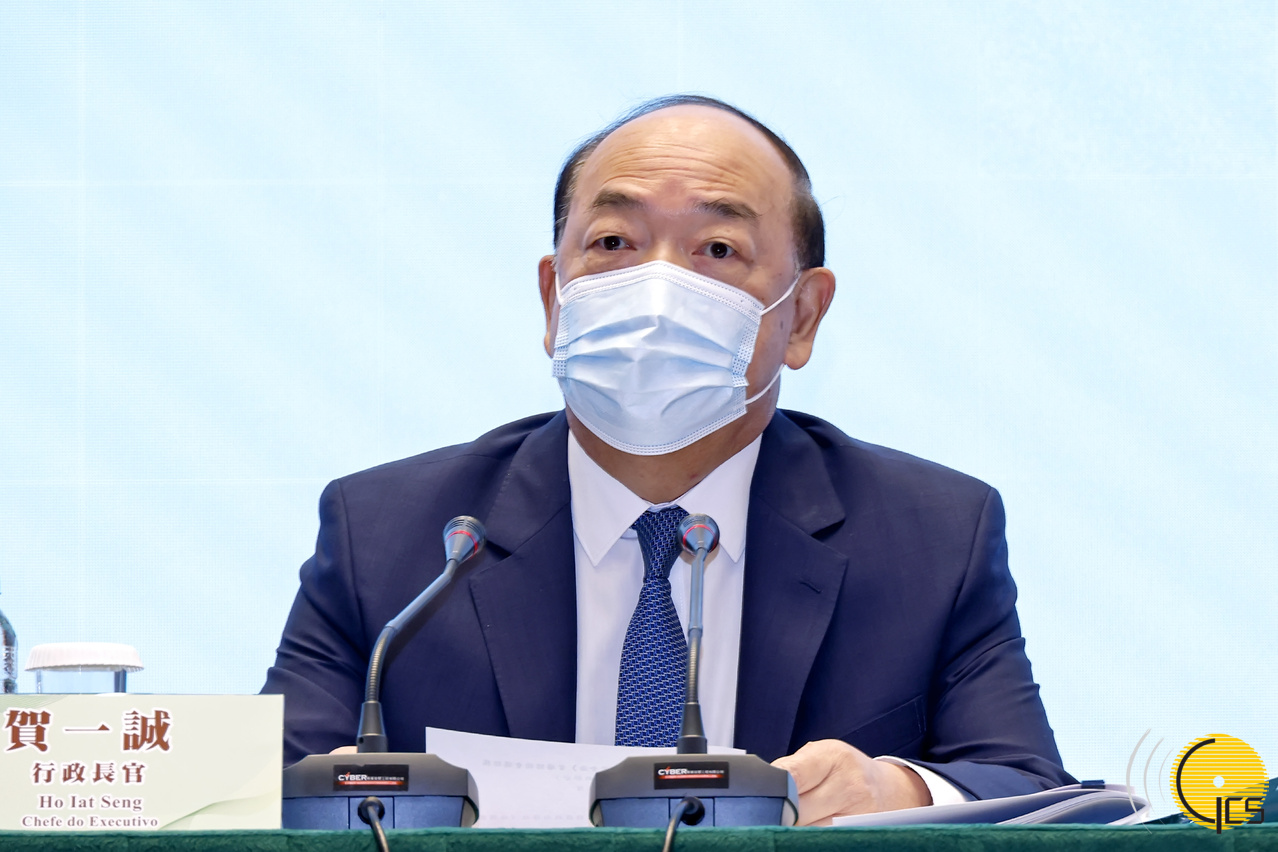 Chefe do Executivo, Ho Iat Seng, na primeira sessão de consulta sobre a revisão da «Lei relativa à defesa da segurança do Estado», esta exclusivamente destinada aos representantes de Macau à Assembleia Popular Nacional, aos membros de Macau no Comité Nacional da Conferência Consultiva Política do Povo Chinês, e a representantes do sector político e jurídico.