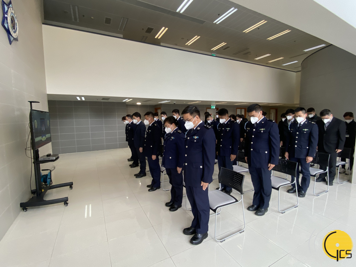 • Pessoal dos Serviços de Alfândega da Região Administrativa Especial de Macau da República Popular da China assiste à transmissão directa da cerimónia memorial, cumprindo os três minutos de silêncio à mesma hora que na cerimónia memorial em homenagem ao ex-presidente Jiang Zemin.