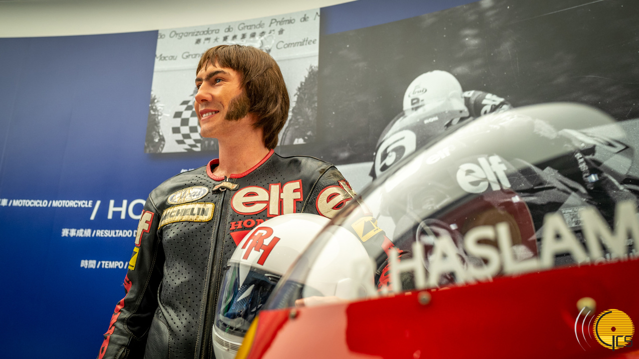 • Estátua de cera de Ron Haslam no Museu do Grande Prémio de Macau. Ron Haslam, conhecido como o “foguete”, alcançou uma brilhante conquista de seis troféus em seis participações.