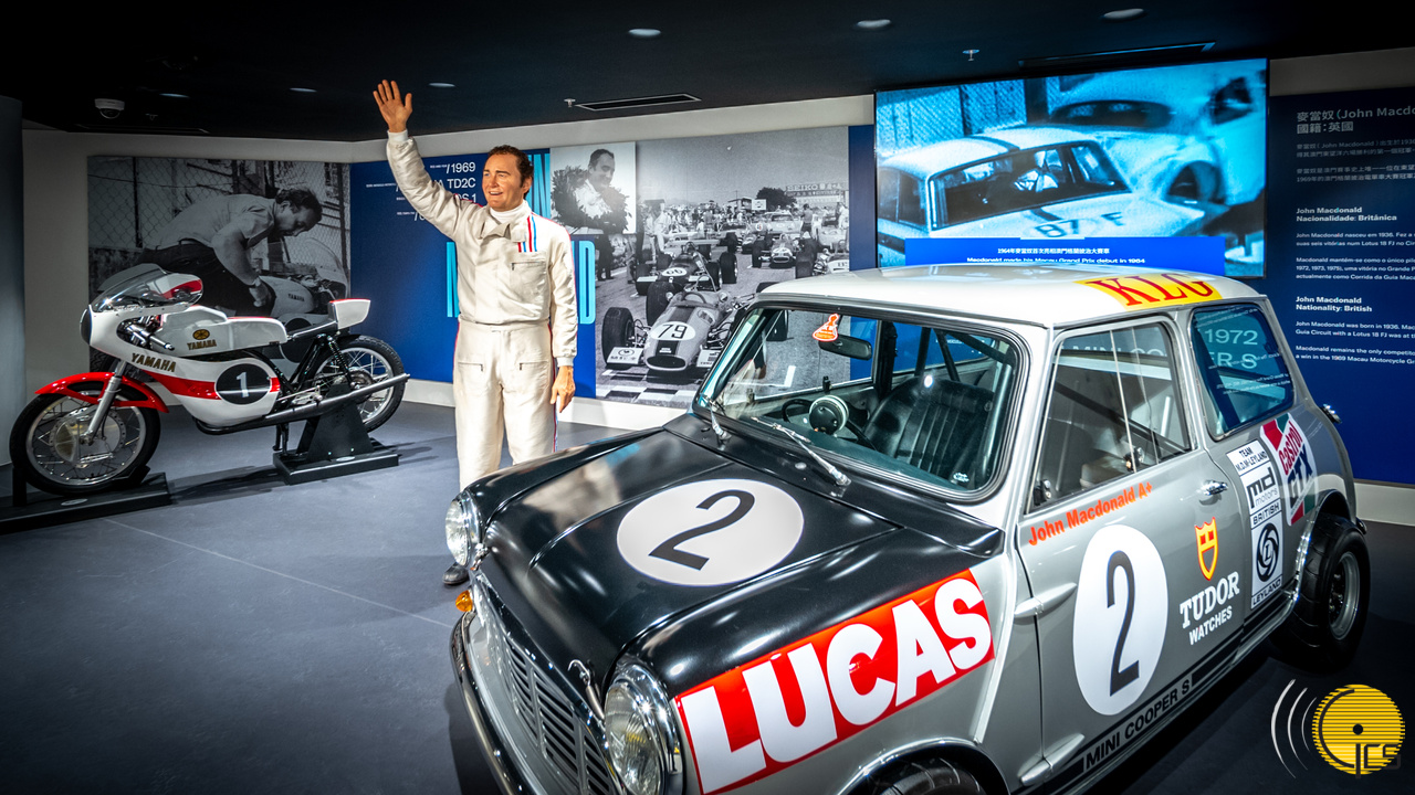 • Estátua de cera de John MacDonald no Museu do Grande Prémio de Macau. MacDonald mantém-se como o único piloto vencedor das três corridas principais do Circuito da Guia.