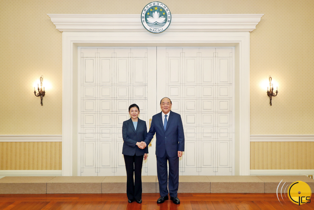 • Chefe do Executivo, Ho Iat Seng, cumprimenta a Ministra da Justiça, He Rong, na Sede do Governo.