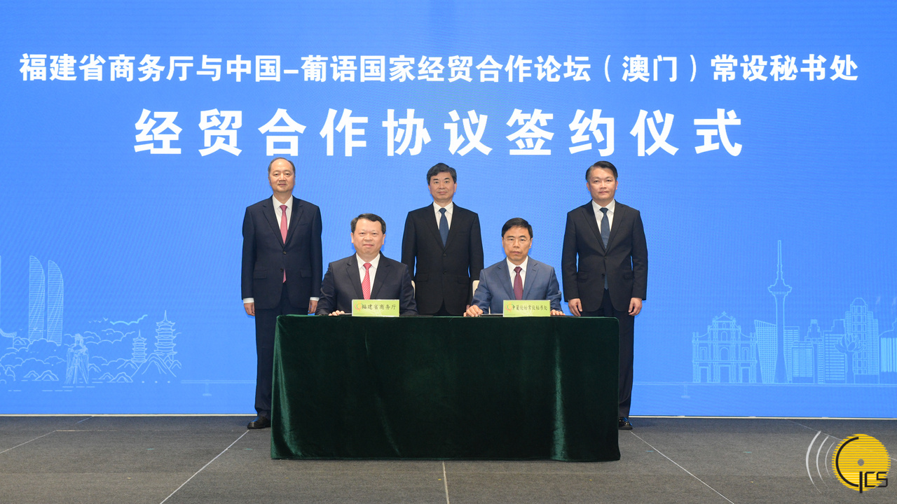 Secretário para a Economia e Finanças, Lei Wai Nong, na cerimónia de assinatura do acordo de cooperação estratégica entre o Departamento de Comércio da Província de Fujian e o Secretariado Permanente do Fórum para a Cooperação Económica e Comerical entre a China e os Países de Língua Portuguesa.