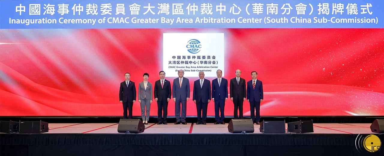• Chefe do Executivo, Ho Iat Seng, e os convidados de honra na cerimónia de descerramento da palca do Centro da Arbitragem da Grande Baía da Comissão de Arbitragem Marítima da China (Sucursal do Sul da China).