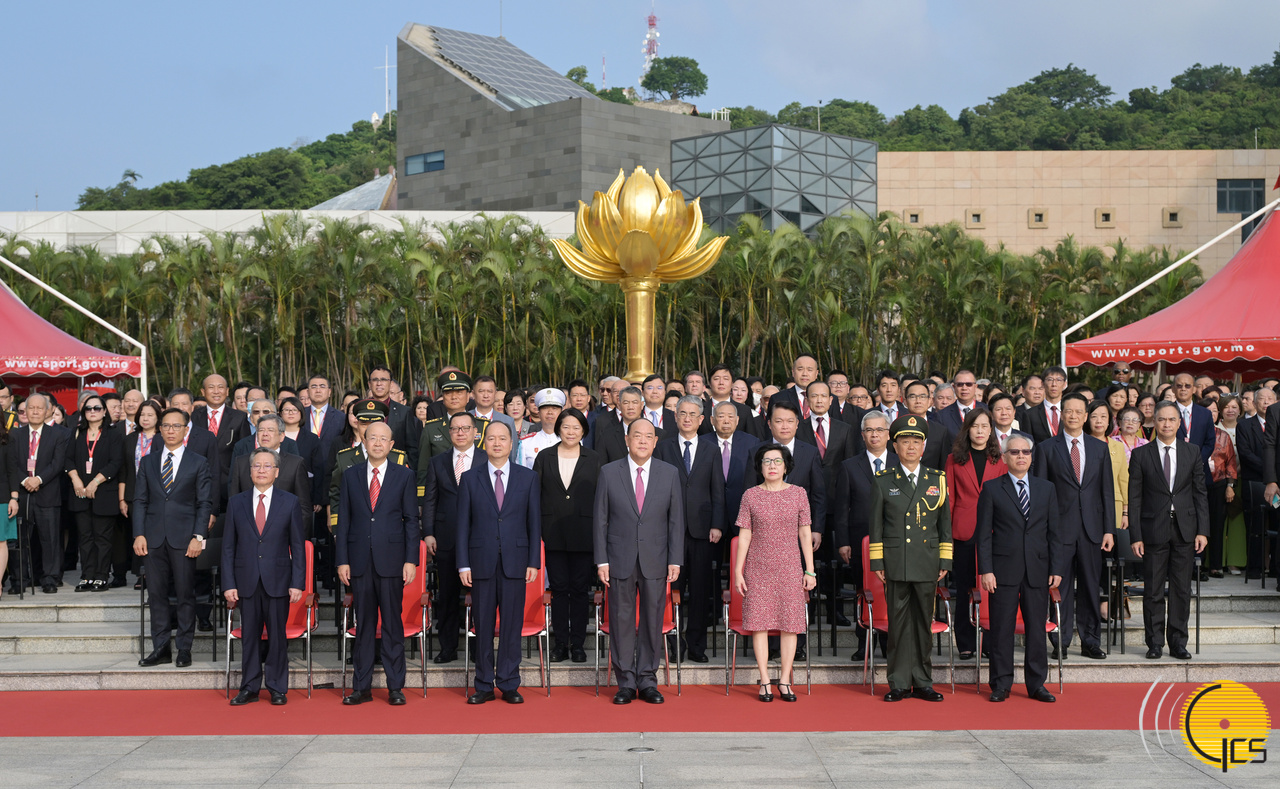 • Chefe do Executivo, Ho Iat Seng, oficiais do Governo Central em Macau, oficiais da Guarnição do ELP em Macau, responsáveis dos órgãos legislativo e judicial da RAEM, titulares dos principais cargos do Governo da RAEM, e individualidades da sociedade civil participam na cerimónia do içar das bandeiras, no âmbito das comemorações do 74.º aniversário da implantação da República Popular da China, na Praça Flor de Lótus Dourado.