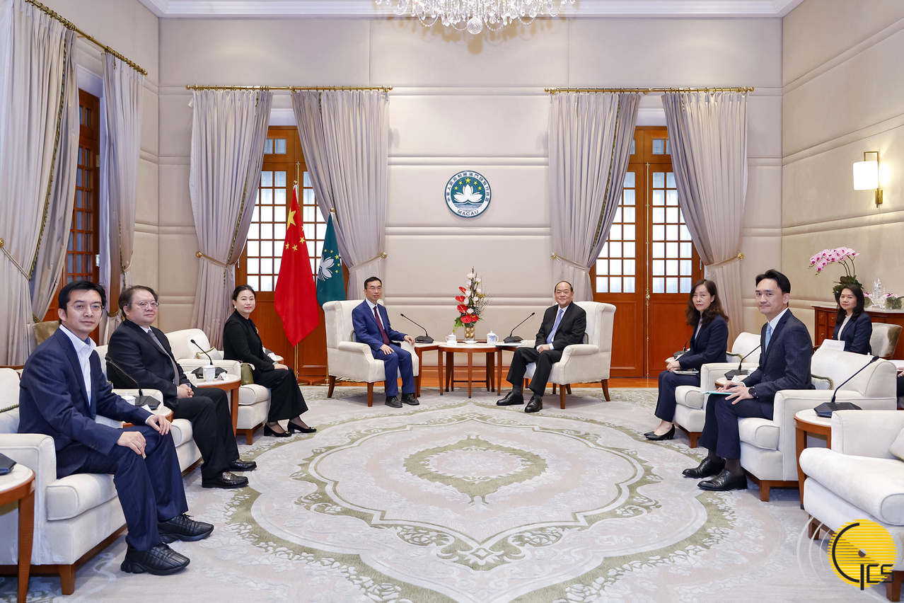 Chefe do Executivo, Ho Iat Seng, num encontro com o membro da Academia Chinesa de Ciências, professor catedrático da Universidade Jiao Tong de Xangai e cientista chefe do Instituto de Pesquisa de Inteligência Artificial de Xangai (Shanghai Artificial Intelligence Research Institute) , Fan Chunhai.