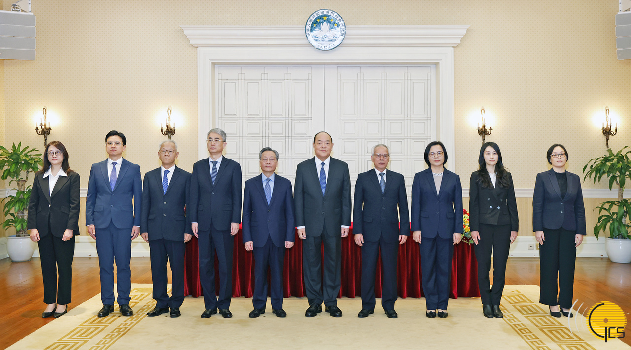 • Chefe do Executivo, Ho Iat Seng, a presidente e os membros da Comissão de Assuntos Eleitorais do Chefe do Executivo na cerimónia de tomada de posse.
