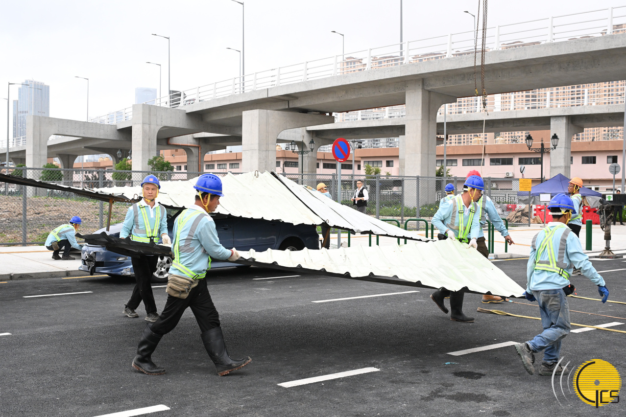• Simulacro de tufão “Peixe Cristal 2024”--veículo danificado pela queda de uma grande barraca de zinco, o Corpo de Polícia de Segurança Pública coordena o uso de máquinas e pessoal da construtora para remover a barraca de zinco, depois de cortada em pedaços.