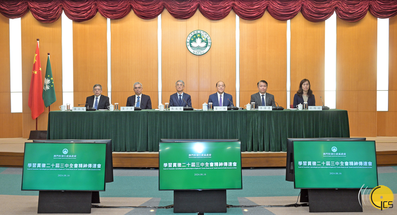 Chefe do Executivo, Ho Iat Seng, preside à sessão de transmissão e aprendizagem sobre o espírito da terceira sessão plenária do 20.º Comité Central do Partido Comunista da China, na Sede do Governo, com o objectivo dos titulares dos principais cargos e altos dirigentes dos serviços públicos a aprenderem e a compreenderem seriamente o espírito da terceira sessão plenária do 20.º CCPCC.