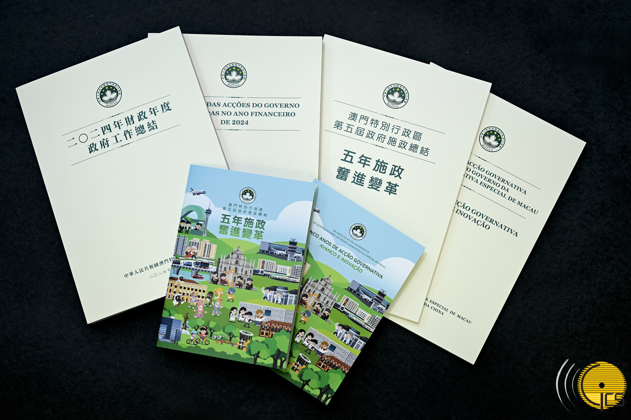 • Exemplares e panfletos do «Balanço das Acções do Governo Realizadas no Ano Financeiro de 2024» e do «Balanço da Acção Governativa do Quinto Governo da Região Administrativa Especial de Macau» disponíveis ao público em vários locais.