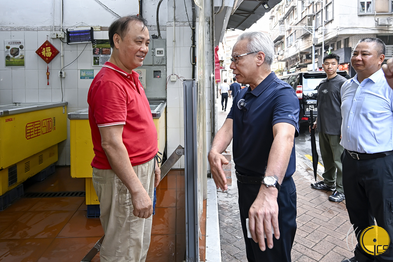 • Durante a inspecção na Rua 5 de Outubro, o Chefe do Executivo, Sam Hou Fai, apelou aos comerciantes para procederem com antecedência às medidas contra o vento e inundações.