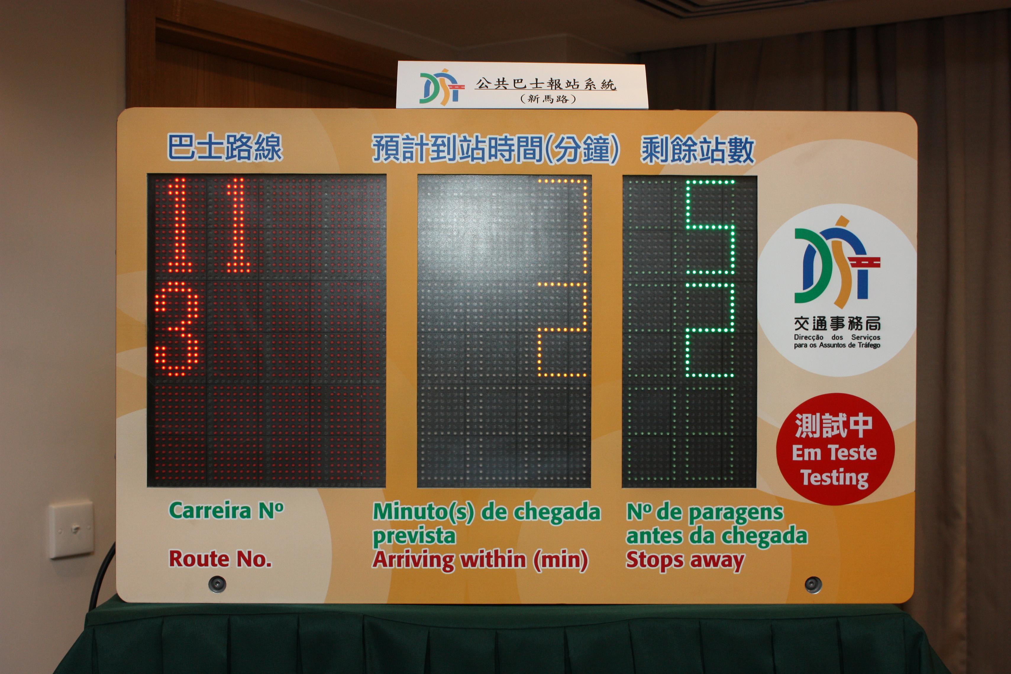 Depois de finalizado o estudo do sistema de informação da localização dos autocarros, a Direcção dos Serviços para os Assuntos de Tráfego instalou-o, nesta primeira fase, na Avenida Horta e Costa, Avenida de Almeida Ribeiro, Avenida do Infante D. Henrique, Rua do Campo e Avenida do Almirante Lacerda, iniciando um período de teste de três meses a partir de quarta-feira (dia 12 de Maio), pelas 11h00. Durante estes três meses, o sistema vai disponibilizar informações sobre a circulação de apenas três carreiras. A DSAT espera que, através da introdução desta inovação, os passageiros possam ter acesso a um maior número de informações sobre a circulação dos autocarros nas vias públicas, facilitando as suas deslocações.