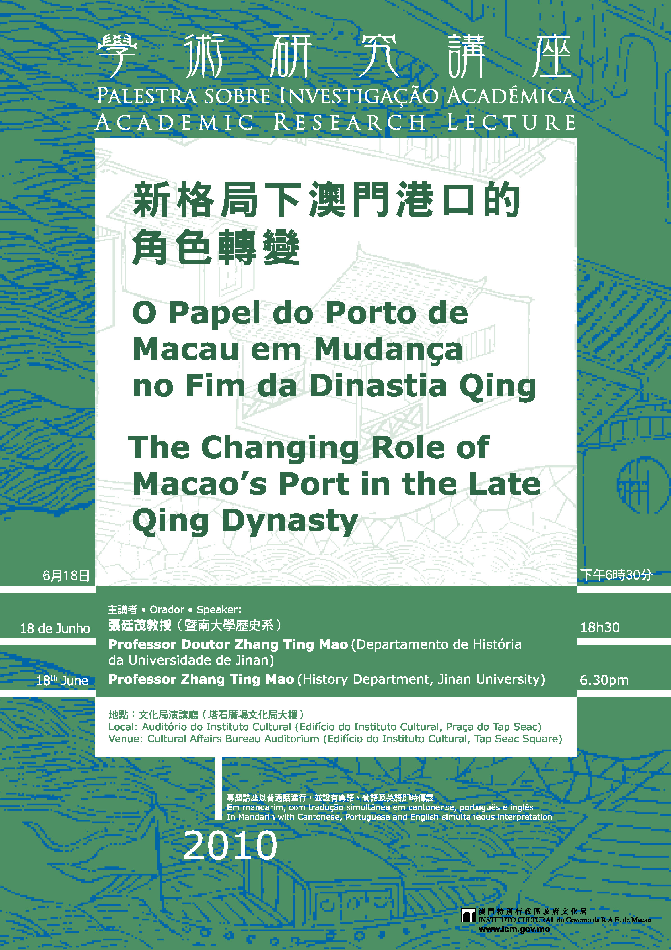 O Instituto Cultural do Governo da RAEM promove no próximo dia 18 de Junho, pelas 18.30 horas, no Auditório do Instituto Cultural (Praça do Tap Seac), uma palestra para a qual convidou Professor Doutor Zhang Ting Mao do Departamento de História da Universidade de Jinan, que abordará o tema “O Papel do Porto de Macau em Mudança no Fim da Dinastia Qing”.