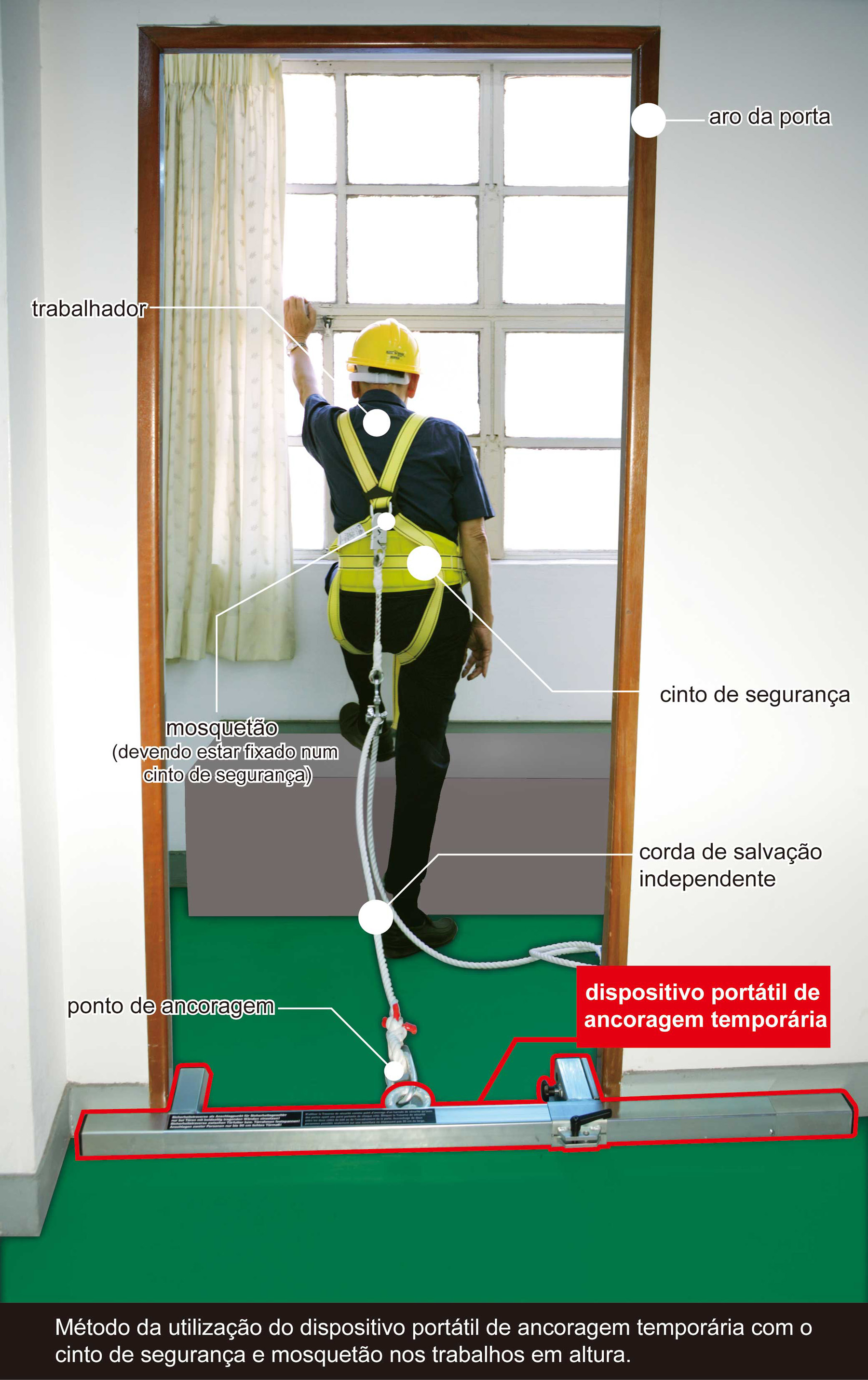 Os dispositivos acima referidos devem ser fixados a objectos estáveis do edifício (como por exemplo: portas ou janelas) e o Dispositivo Portátil de Ancoragem Temporária deve está fixado numa corda de salvação independente antes do início do trabalho, a fim de exercer a sua função de prevenção de queda, como demonstrado na figura seguinte.