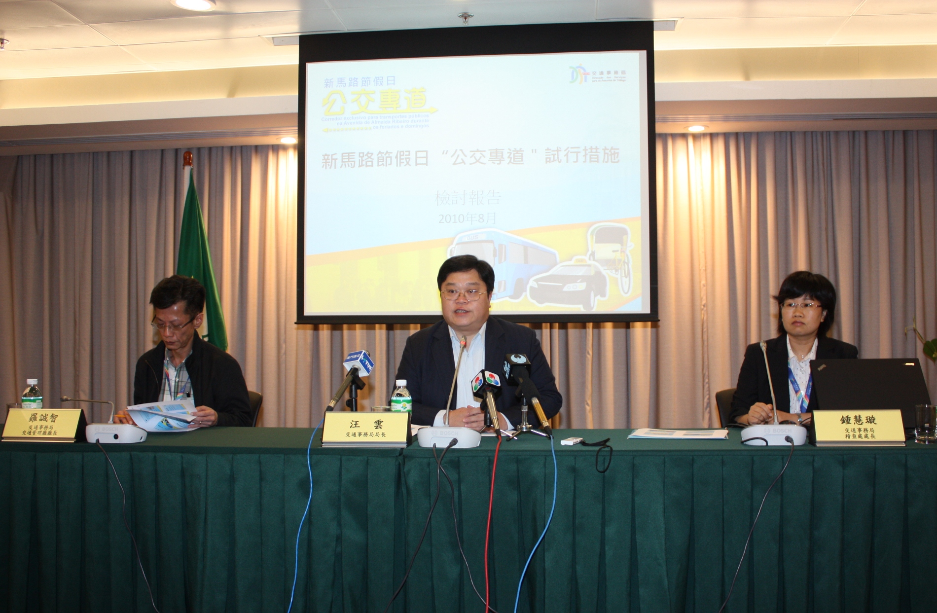 A DSAT realizou hoje (dia 12 de Agosto) uma conferência de imprensa onde marcaram presença o seu director, Wong Wan, bem como o chefe de Departamento de Gestão de Tráfego, Lo Seng Chi, e a chefe de Divisão de Fiscalização, Chong Wai Sun, para apresentar o balanço do funcionamento experimental do corredor exclusivo para transportes públicos da Avenida de Almeida Ribeiro durante os feriados e domingos.