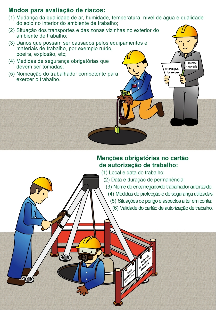 Considera-se “espaço confinado” qualquer local fechado e susceptível de dar origem a riscos graves, designadamente, canalizações de águas residuais subterrâneas, caixas de visita, poços, tanques, fossas, túneis, dependências vedadas, caldeiras, cisternas e escotilhas. Os riscos graves que podem ocorrer são os seguintes: 1) incêndio ou explosão devido à existência de explosivos, gases inflamáveis, líquidos inflamáveis ou sólidos inflamáveis na atmosfera; 2) perda dos sentidos dos trabalhadores devido à subida da temperatura do ar no ambiente de trabalho; 3) perda dos sentidos ou asfixia dos trabalhadores devido à presença de gases, fumos e vapores ou insuficiência de oxigénio na atmosfera; 4) afogamento dos trabalhadores devido à subida do nível de quaisquer líquidos e 5) deslizamento de materiais sólidos que pode provocar asfixia dos trabalhadores.