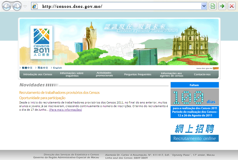 O Recenseamento da População de 2011 realizar-se-á no período de 12 a 26 do próximo mês de Agosto. A Direcção dos Serviços de Estatística e Censos (DSEC) estabeleceu o website dos Censos http://censos.dsec.gov.mo, que entrou em funcionamento no centésimo dia da contagem decrescente para a realização dos Censos.