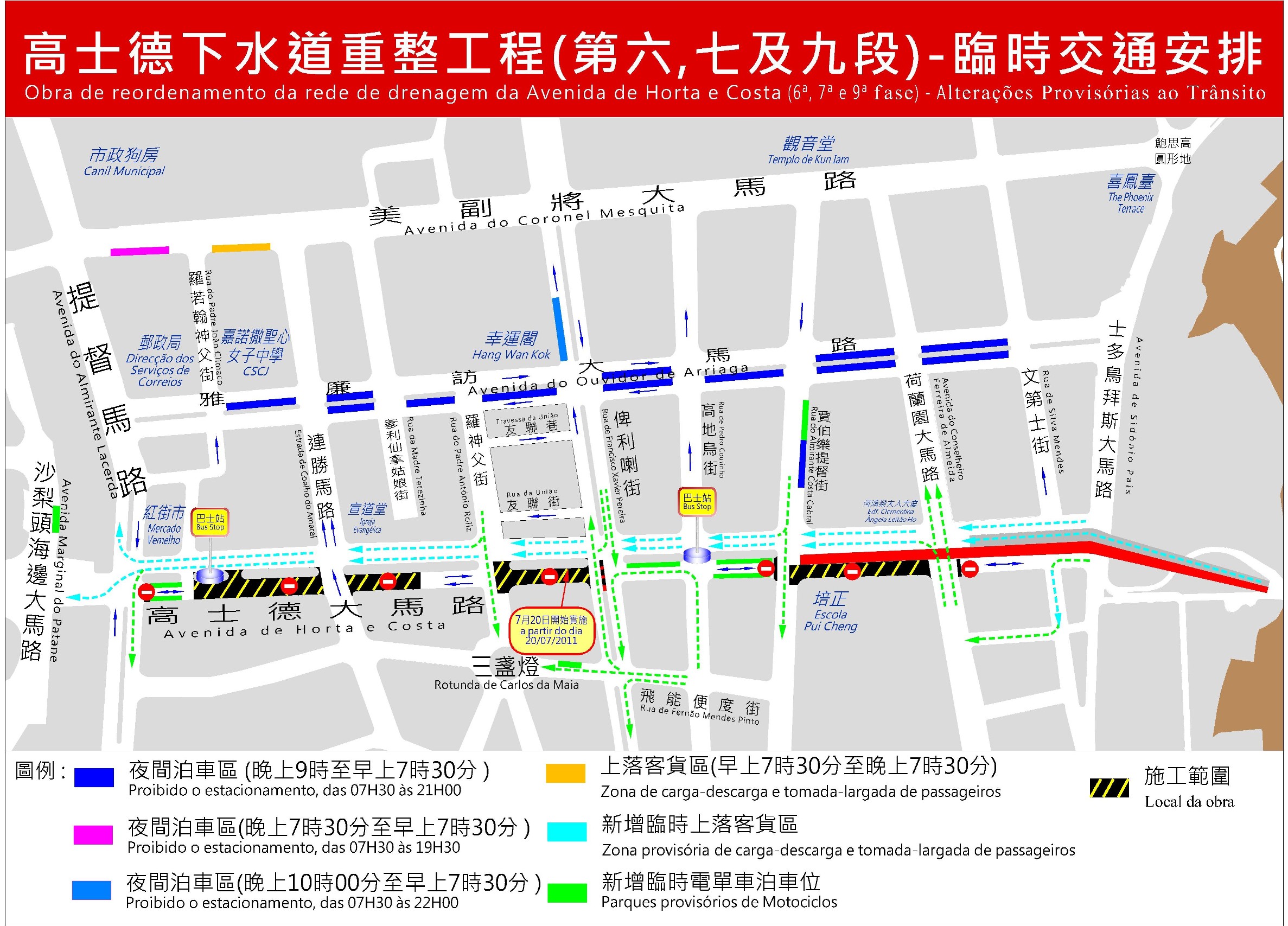 Os trabalhos referentes ao 7.º troço da obra de reordenamento da rede de drenagem da Avenida de Horta e Costa, compreendido entre a Estrada do Coelho do Amaral e Rua de Francisco Xavier Pereira, tiveram já início no mês transacto, foi dividido num total de 3 subtroços, contudo devido ao impacto negativo causado pelas chuvas, veio a Administração introduzir alguns ajustamentos no plano de trabalhos destes subtroços. No momento encontra-se em curso a realização dos trabalhos do subtroço 7A, que segundo as previsões poderá estar concluído em meados de Agosto, findo o qual será então dado início da realização dos trabalhos referentes ao subtroço 7B. A par disso, terá oficialmente início a partir das 10:00 horas da próxima quarta-feira (dia 20 de Julho) a realização dos trabalhos referentes ao subtroço 7C, podendo segundo as previsões os trabalhos dos dois subtroços estar simultaneamente concluídos em meados de Setembro.