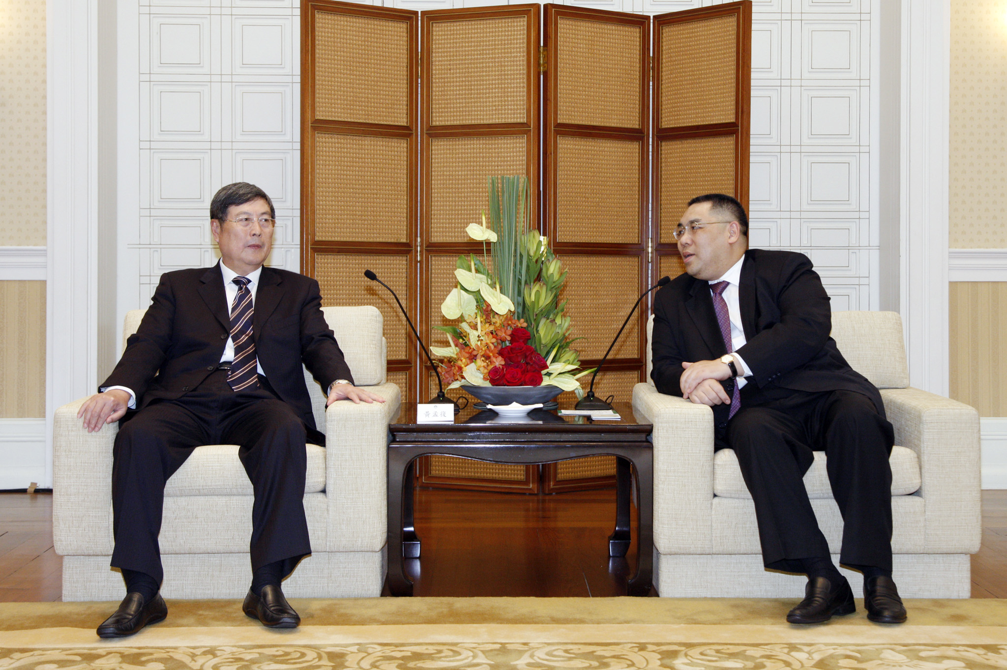 O Chefe do Executivo, Chui Sai On, e o vice-presidente da Conferência Consultiva Política do Povo Chinês e presidente da Federação Nacional da Indústria e Comércio da China, Huang Mengfu, trocaram impressões sobre a promoção do desenvolvimento interactivo dos quatro territórios dos dois lados do estreito, no âmbito das oportunidades do 12º plano quinquenal nacional, durante um encontro realizado, esta tarde (28 de Outubro), em Macau, na Sede do Governo.