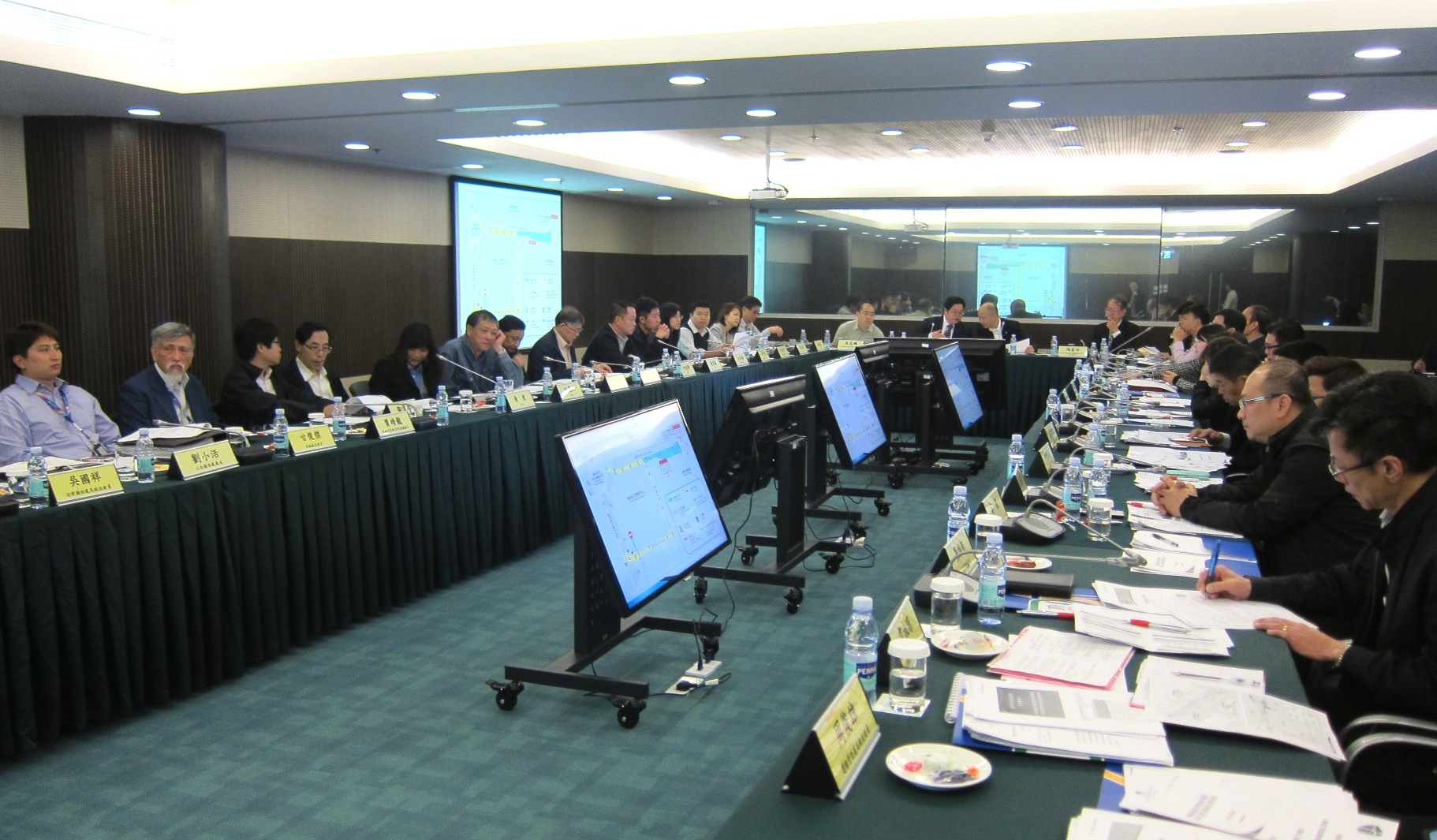Os representantes presentes nesta reunião são respectivamente, o Consultor do GIT, Chow Wai Tak, o Técnico Superior do GIT, Cheang Chi Mak, o Chefe da Divisão de Coordenação da DSAT, Mok Soi Tou e o Chefe Funcional da Divisão de Coordenação do Departamento de Gestão de Tráfego, Choi Man Cheng.