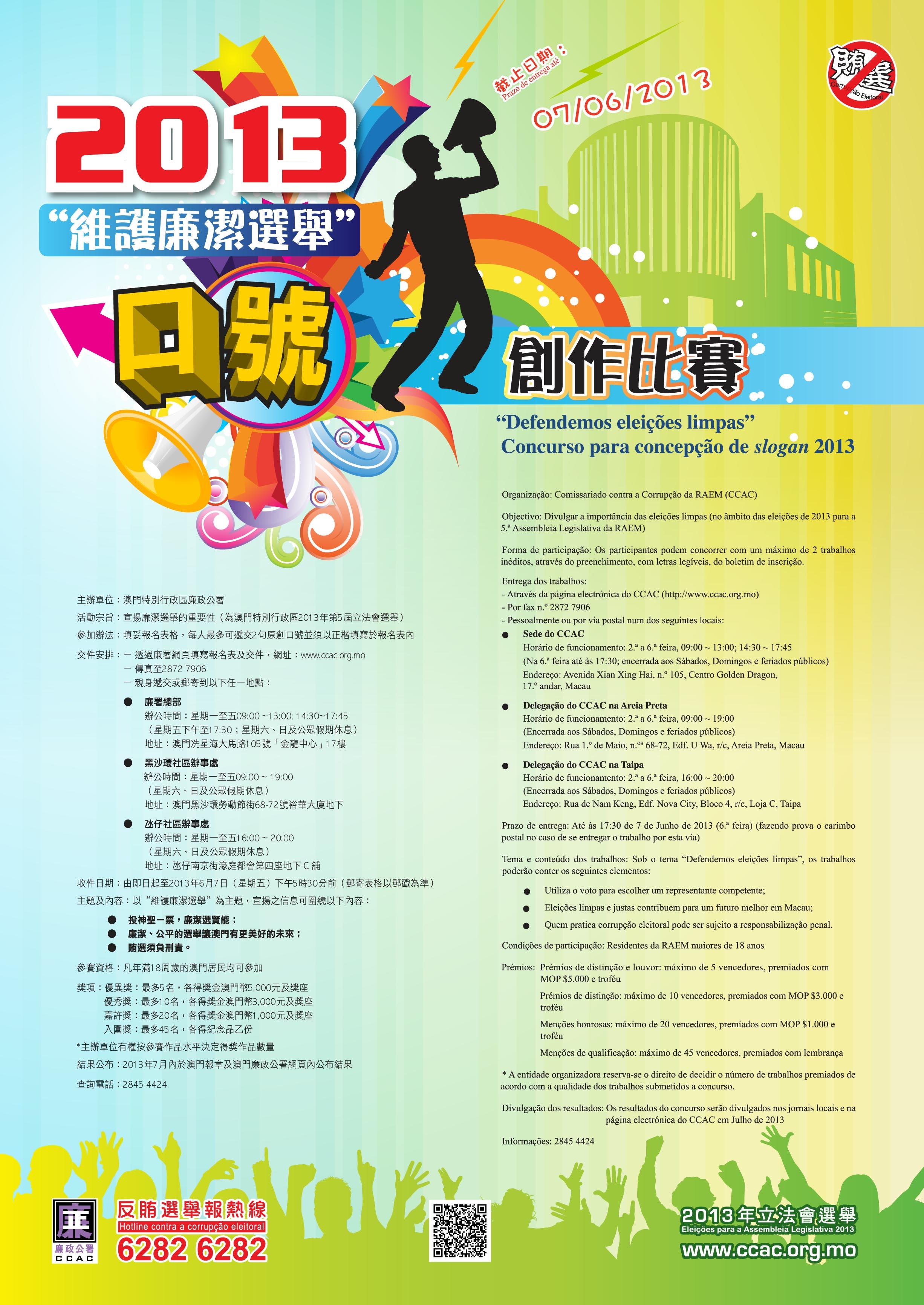 O Comissariado contra a Corrupção (CCAC), associando-se às eleições para a 5.ª Assembleia Legislativa de Macau, organiza o Concurso para concepção de slogan – “Defendemos eleições limpas”, tendo como objectivo permitir aos cidadãos, ao longo do processo da concepção do trabalho, reflectir de forma mais profunda sobre a justiça, a imparcialidade e a integridade das eleições para a Assembleia Legislativa, bem como divulgar a importância das eleições limpas. É bem vinda a participação dos residentes da RAEM maiores de 18 anos.