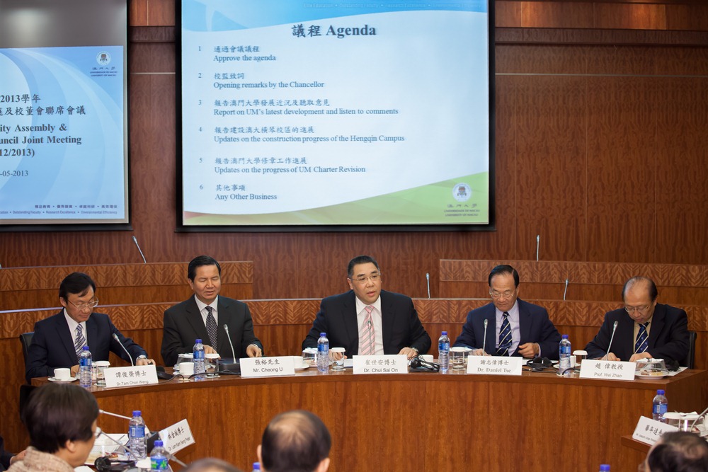 Realizou-se recentemente a reunião conjunta da Assembleia e do Conselho da Universidade de Macau (UM) do ano lectivo de 2012/2013, que foi presidida pelo Chefe do Executivo da RAEM e Chanceler da UM, Chui Sai On. Nesta reunião estiveram presentes o Secretário para os Assuntos Sociais e Cultura, Cheong U, o chefe do Gabinete do Chefe do Executivo, Tam Chon Weng, representantes da comunidade local, dirigentes da universidade, assim como os representantes dos antigos e actuais alunos da instituição.