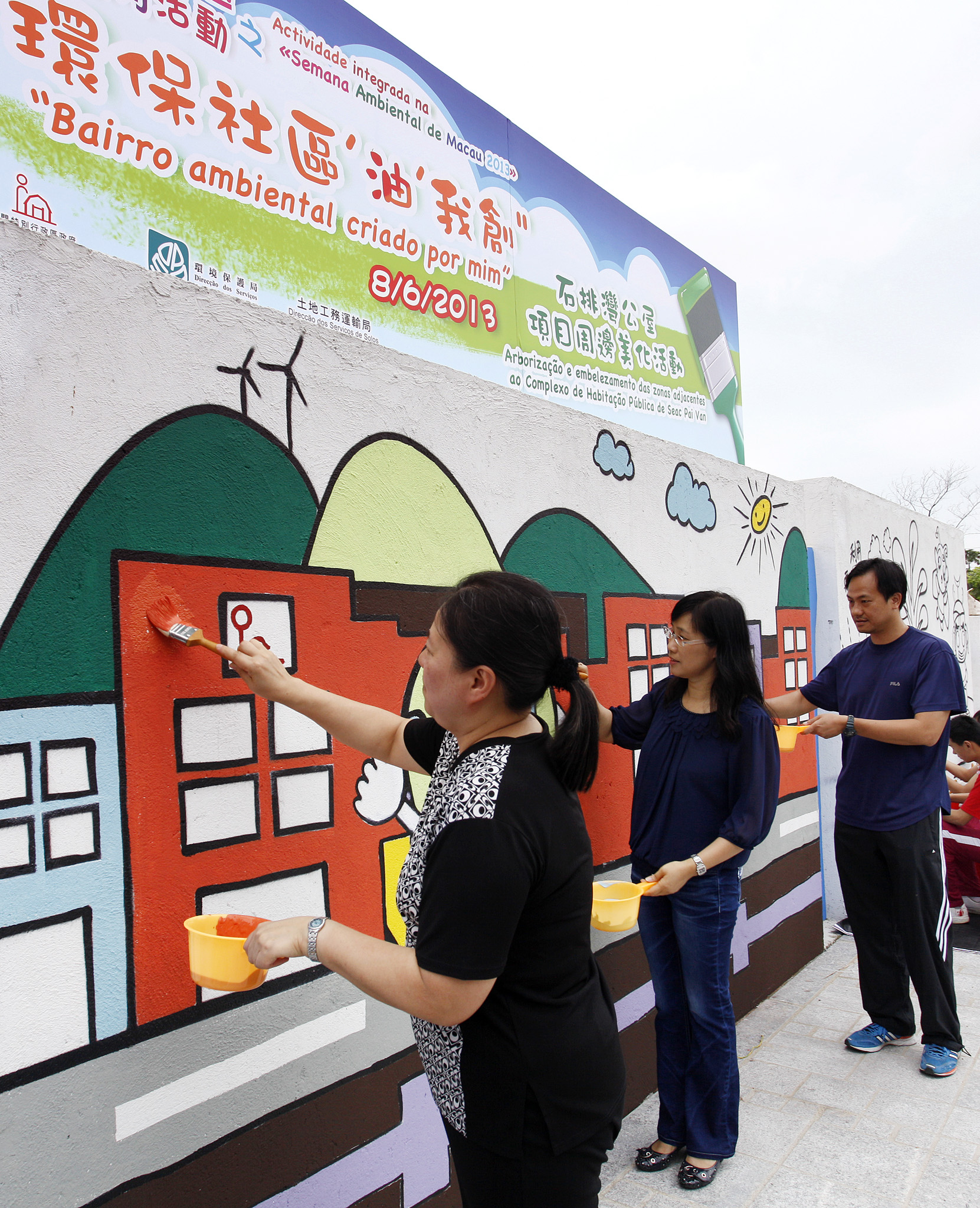 Foi realizada na tarde de hoje (dia 8 de Junho) a actividade “Bairro ambiental criado por mim” e a cerimónia de inauguração que foi presidida pela Subdirectora do IH, Kuoc Vai Han, pela Subdirectora da DSPA, Vong Man Hung e pelo Chefe do Departamento de Infra-estruturas da DSSOPT, Kuok Chi Cheong, e que contou com a participação de cerca de 100 alunos e professores de eco-escolas e representantes de hotéis verdes, com vista a embelezar as imediações co Complexo de Habitação Pública de Seac Pai Van e divulgar a sensibilidade ambiental, através das pinturas com o tema de protecção ambiental nas 110 vedações localizadas junto dos lotes da habitação pública.