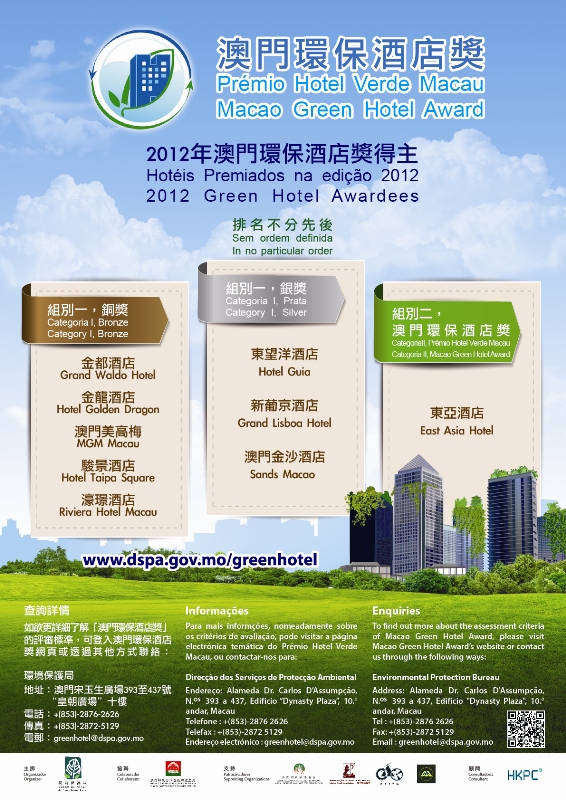 Após um procedimento de avaliação rigorosa da edição do “Prémio Hotel Verde Macau 2012”, houve um total de 9 hotéis locais que foram galardoados, tendo sido atribuído o prémio de prata da Categoria I ao Sands Macao, Hotel Grande Lisboa e Hotel Guia e o prémio de bronze da Categoria I ao MGM Macau, Hotel Grande Waldo, Riviera Macau, Hotel Dragão Dourado e Rossio da Taipa. O Hotel East Asia foi premiado com o Prémio Hotel Verde Macau, na Categoria II, sendo a primeira vez que hotéis de 2 estrelas participaram no evento e um deles venceu.