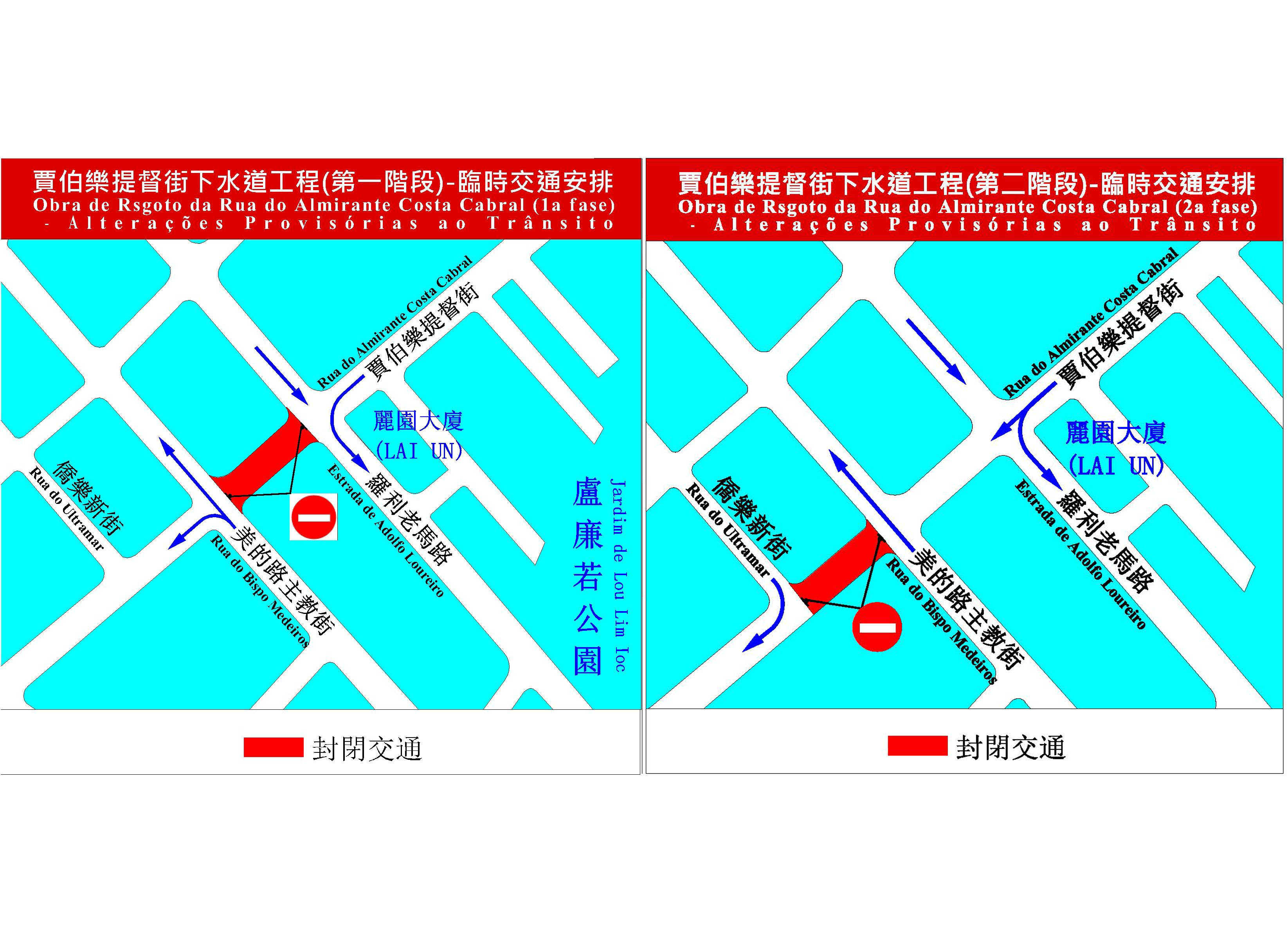 E em harmonia com a realização destas obras, serão implementadas pela DSAT condicionamentos de trânsito, pelo que apela-se aos condutores para estarem atentos às sinalizações de trânsito provisoriamente instaladas no local. E a fim de minimizar na medida dos possíveis o impacto destas obras trânsito, a obra de drenagem da Rua do Almirante Costa Cabral será igualmente realizada em duas fases, sendo a partir do próximo sábado (dia 13 de Julho), pelas 10:00 horas, interditado o trânsito rodoviário do 1.º troço da Rua do Almirante Costa Cabral, compreendido entre a Estrada de Adolfo Loureiro e a Rua do Bispo Medeiros. E em seguida será interditado o trânsito do 2.º troço da Rua do Almirante Costa Cabral, compreendido entre a Rua do Bispo Medeiros e a Rua do Ultramar, sendo o prazo global da obra de cerca de 40 dias. E durante a implementação dos condicionamentos de trânsito, o trânsito em direcção da Rotunda do Almirante Costa Cabral terá que seguir pela Rua do Tap Seac, ou pela Rua de Afonso de Albuquerque, ou pela Estrada do Cemitério. Além disso, será também alterado o itinerário da carreira n.º 17, sendo provisoriamente desactivado as paragens de autocarros da Rua do Almirante Costa Cabral / Rua de Sacadura Cabral e da Escola Primária Tong Nam, passando assim a parar provisoriamente na paragem de autocarro localizada junto das instalações do IAS.