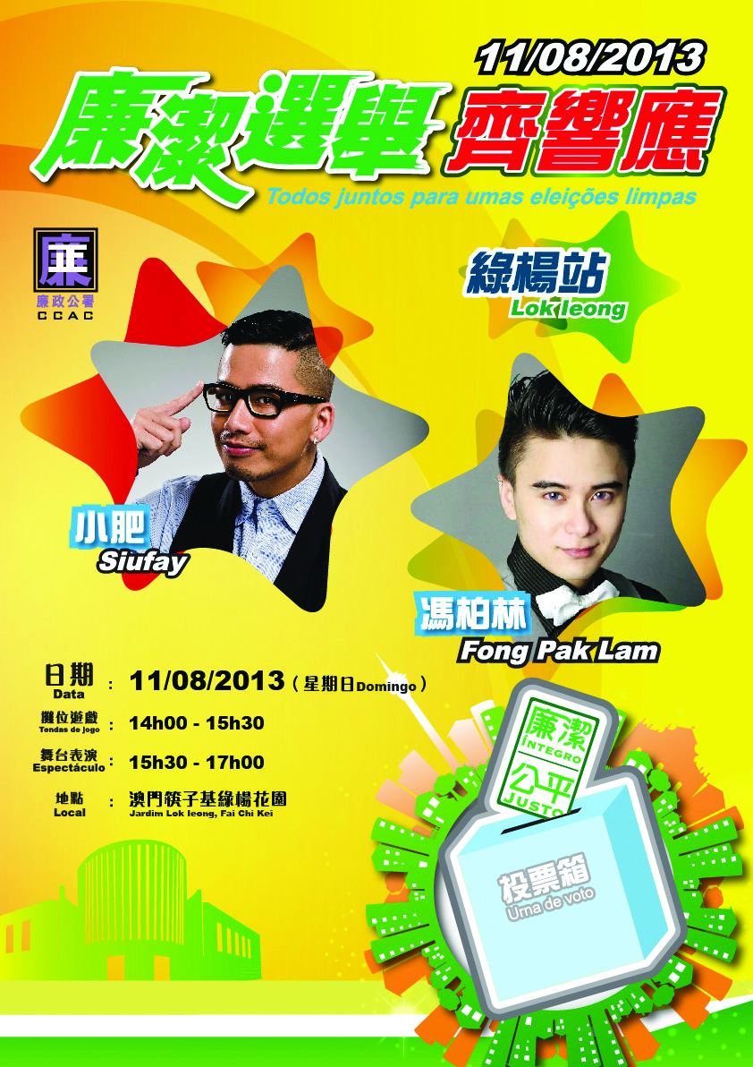 Aproximando-se as eleições para a 5.ª Assembleia Legislativa da RAEM, previstas para o dia 15 de Setembro do corrente ano, e tendo por objectivo a sensibilização da população para a mensagem de eleições limpas, o Comissariado contra a Corrupção (CCAC) realizará, em Agosto, três espectáculos de variedades subordinados ao tema “Todos juntos para umas eleições limpas”. O primeiro evento terá lugar, na tarde do dia 11 de Agosto, no Jardim Lok Ieong do Fai Chi Kei, onde se realizará igualmente a cerimónia de entrega de prémios do Concurso de concepção de slogan – “Defendemos eleições limpas”. Aguarda-se a presença de todos os cidadãos, numa manifestação de apoio a umas eleições íntegras.